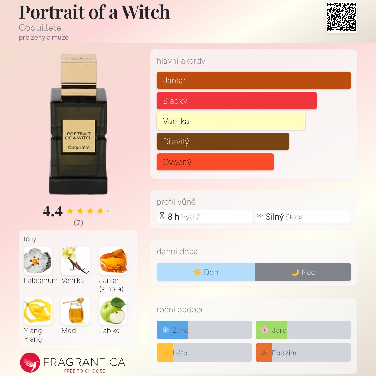 Portrait of a Witch podle Coquillete je Orientální Vanilla vůně pro ženy a muže. Toto je nová vůně. Portrait of a Witch byl/a uveden/a v roce 2025. "Nosem" za touto vůní je Rosa Vaia. Vrchní tóny jsou Zelené jablko, Pomeranč, Brusinky a Mango; střední tóny jsouMed, Ylang-Ylang, Heřmánek, Zelený čaj, Šalvěj muškátová a Rum ; základní tóny jsou Vanilka, Labdanum, Jantar (ambra), Tabák, Cedr a Dubový mech.