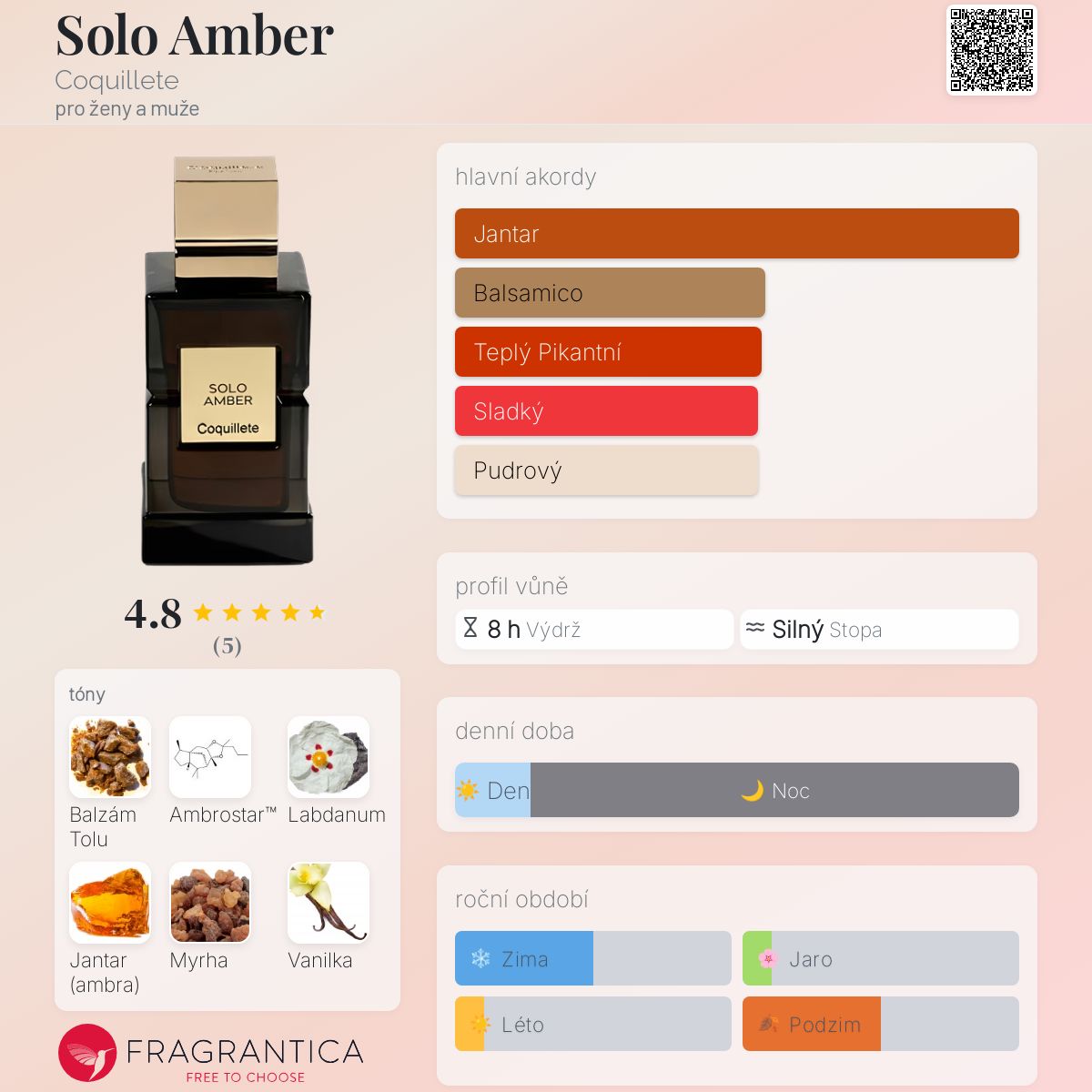 Solo Amber podle Coquillete je Orientální Vanilla vůně pro ženy a muže. Toto je nová vůně. Solo Amber byl/a uveden/a v roce 2025. "Nosem" za touto vůní je Rosa Vaia. Vrchní tóny jsou Lískový oříšek a Karamel; střední tóny jsouBalzám Tolu, Myrha, Koriandr a Vetiver ; základní tóny jsou Ambrostar™, Labdanum, Jantar (ambra), Vanilka, Benzoin a Ambra.