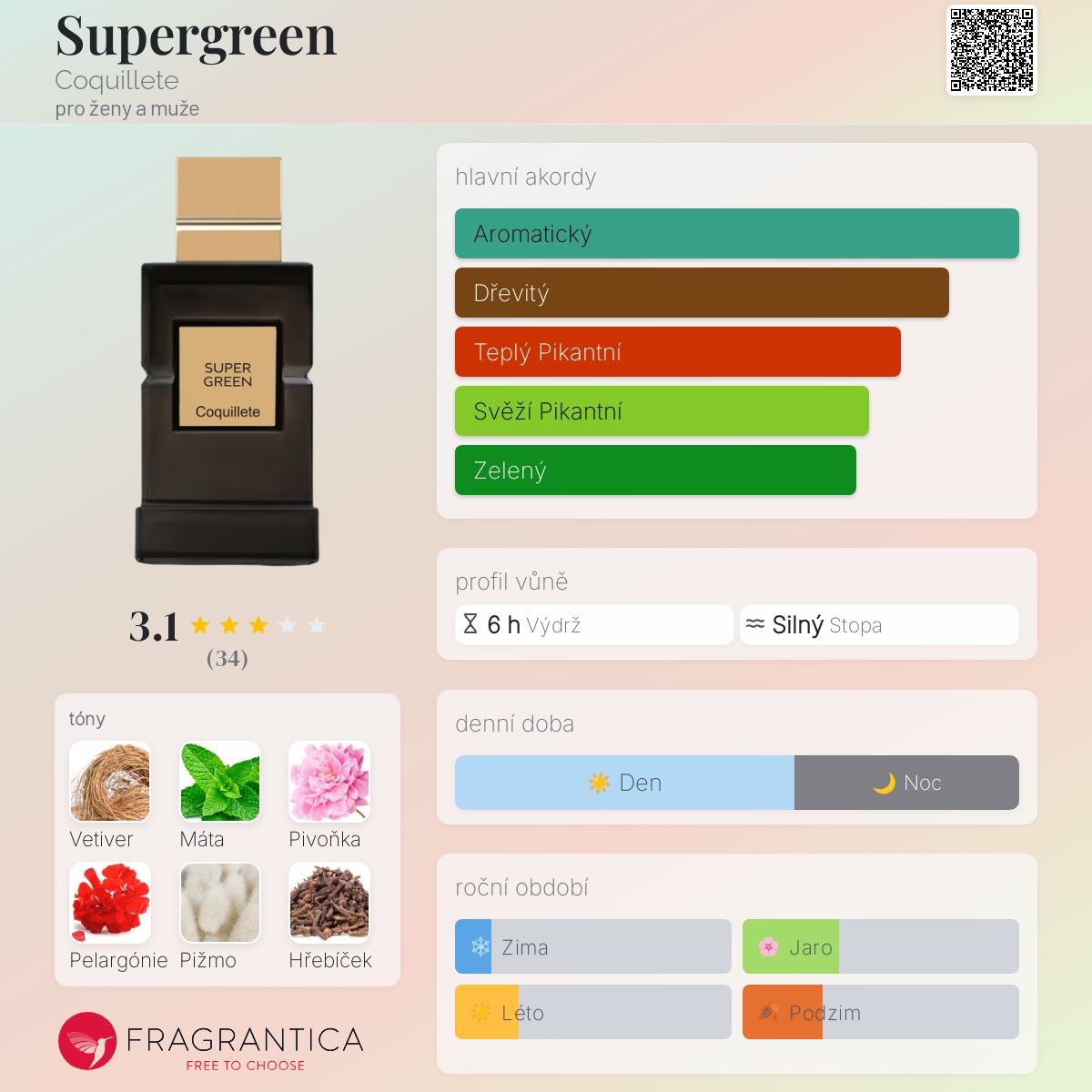 Supergreen podle Coquillete je Aromatic Green vůně pro ženy a muže. Supergreen byl/a uveden/a v roce 2017. "Nosem" za touto vůní je Rosa Vaia. Vrchní tóny jsou Máta, Pelargónie, Hřebíček, Citrón a Damašská růže; střední tóny jsouPivoňka, Santalové dřevo, Šafrán, Drobné ovoce, Jantar (ambra) a Kadidlo ; základní tóny jsou Vetiver, Pižmo, Bílé pižmo a Cedr.