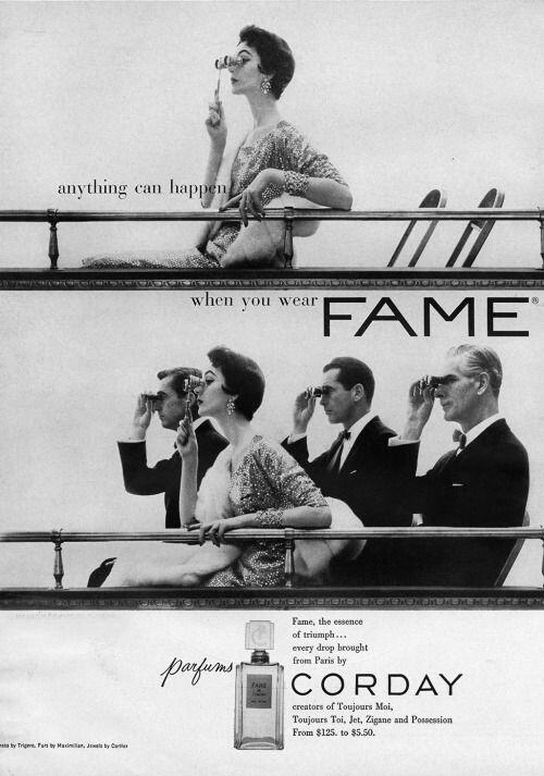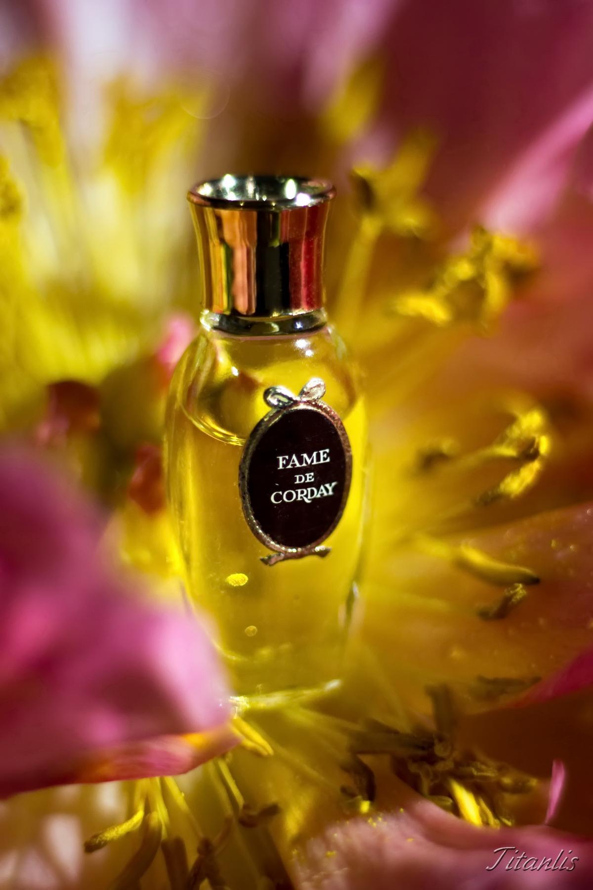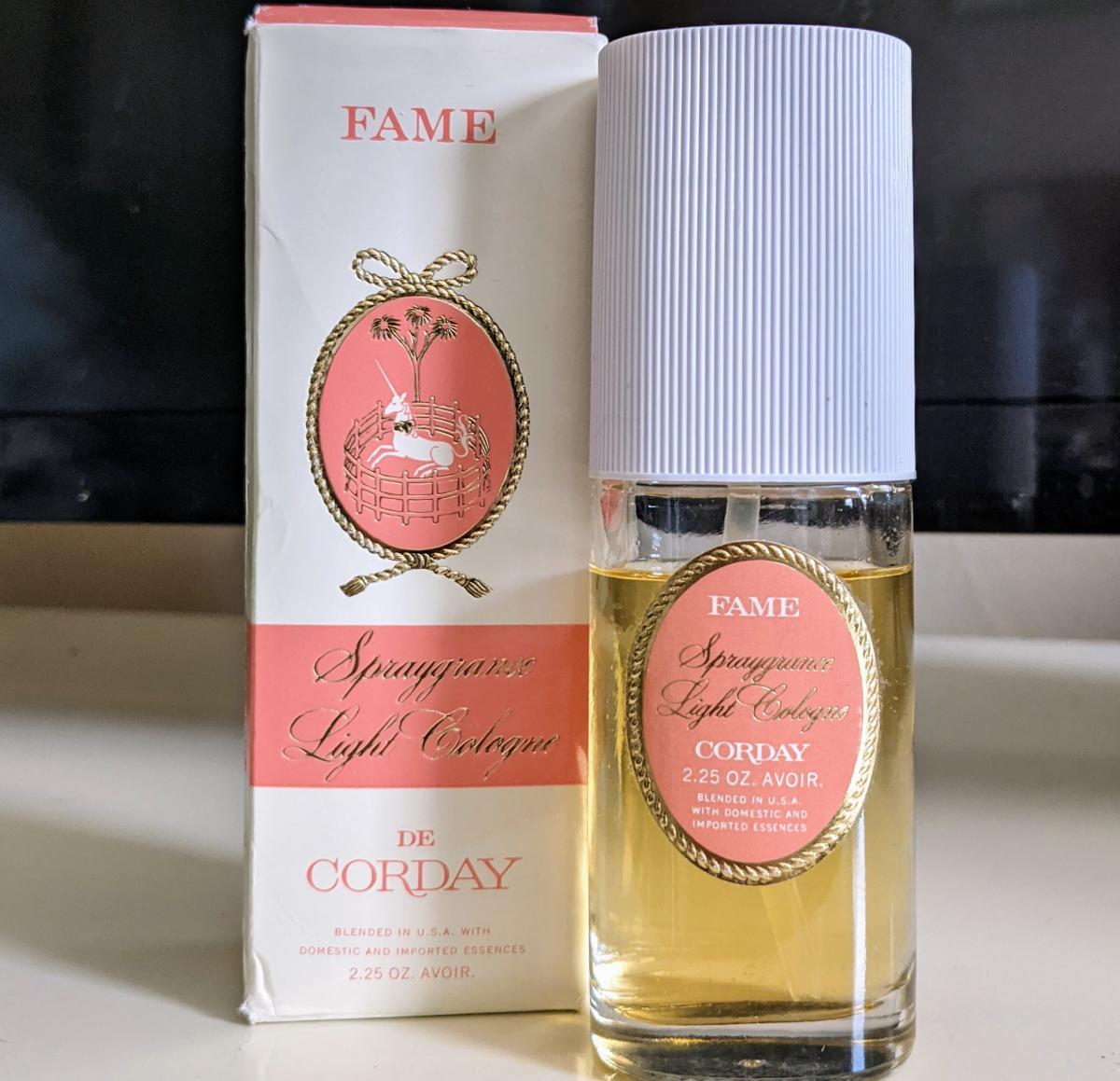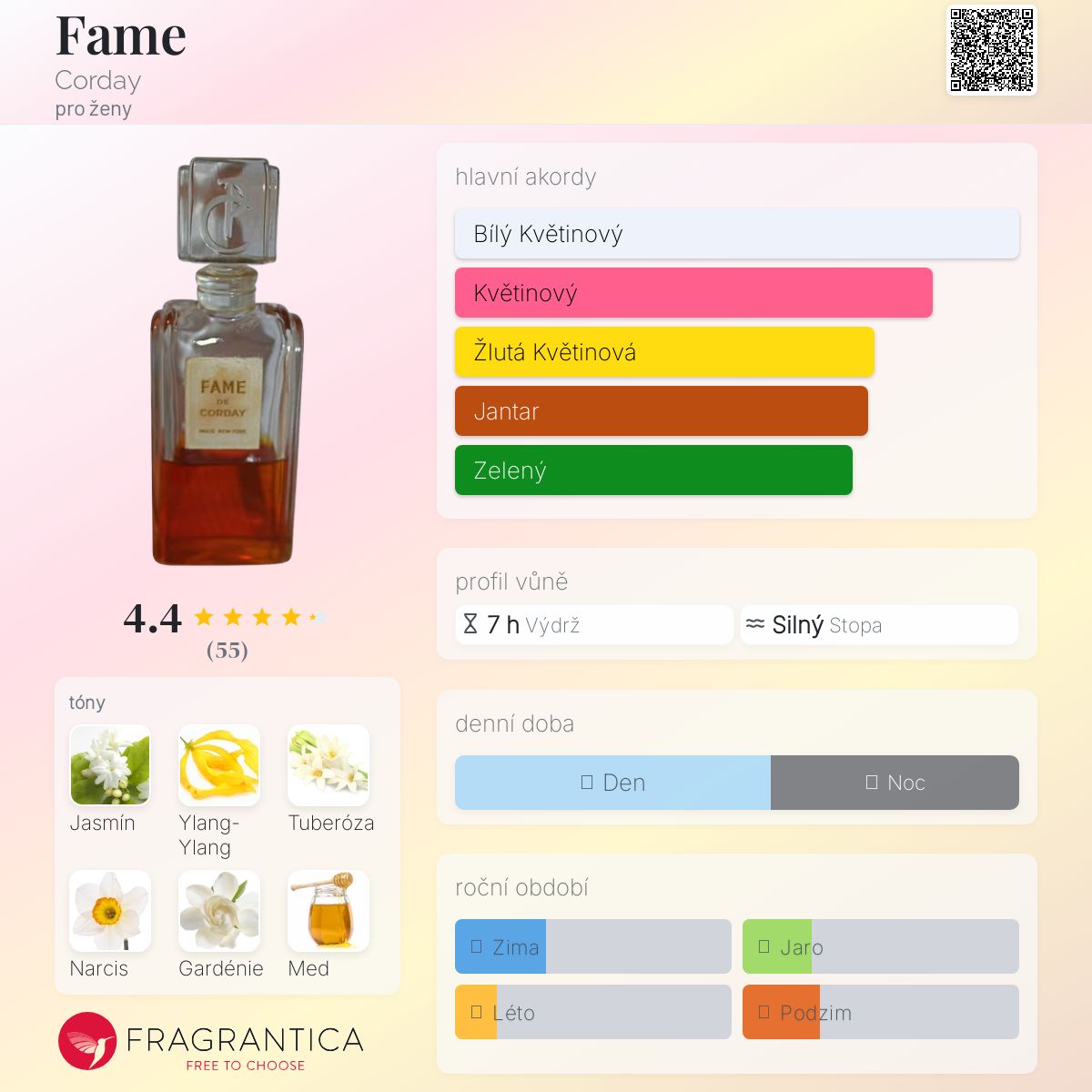 Fame podle Corday je Floral vůně pro ženy. Fame byl/a uveden/a v roce 1946. Vrchní tóny jsou Narcis, Med, Akát, Lipový květ, Aldehydy, Limetka, Kořeněné tóny, Bergamot a Galbanum; střední tóny jsouJasmín Sambac, Ylang-Ylang, Tuberóza, Gardénie, Pomerančový květ, Karafiát, Hřebíček, Hyacint, Konvalinka, Šeřík, Kosatec, Čaj a Orchidej ; základní tóny jsou Jantar (ambra), Cibetka, Včelí vosk, Benzoin, Peruánský balzám, Tabák, Dubový mech, Vetiver, Pačuli, Santalové dřevo, Fazole tonka, Labdanum a Pižmo.