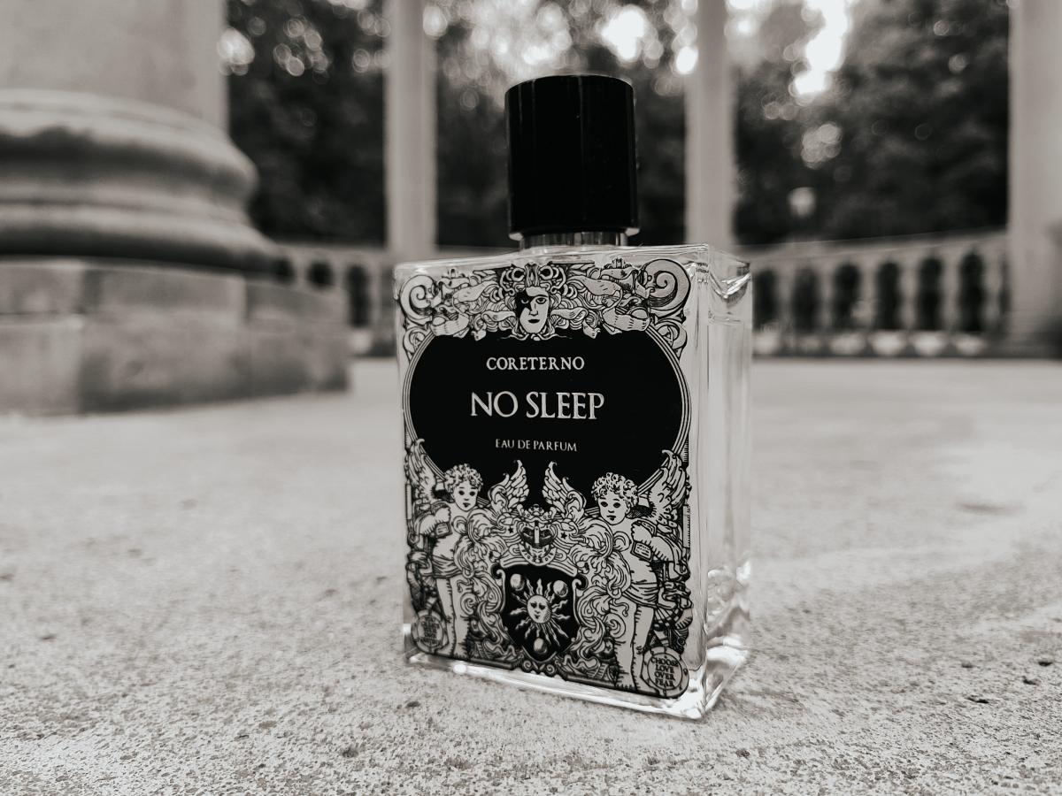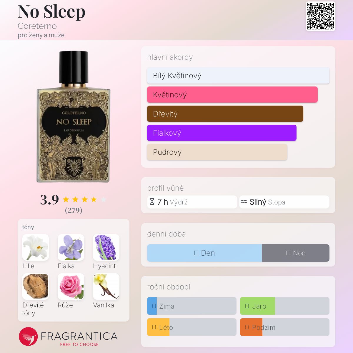 No Sleep podle Coreterno je Floral vůně pro ženy a muže. No Sleep byl/a uveden/a v roce 2021. "Nosem" za touto vůní je Luca Maffei. Vrchní tóny jsou Hyacint, Bílá růže a Bergamot; střední tóny jsouLilie, Fialka a Jasmín ; základní tóny jsou Bílé dřevo, Vanilka a Pačuli.