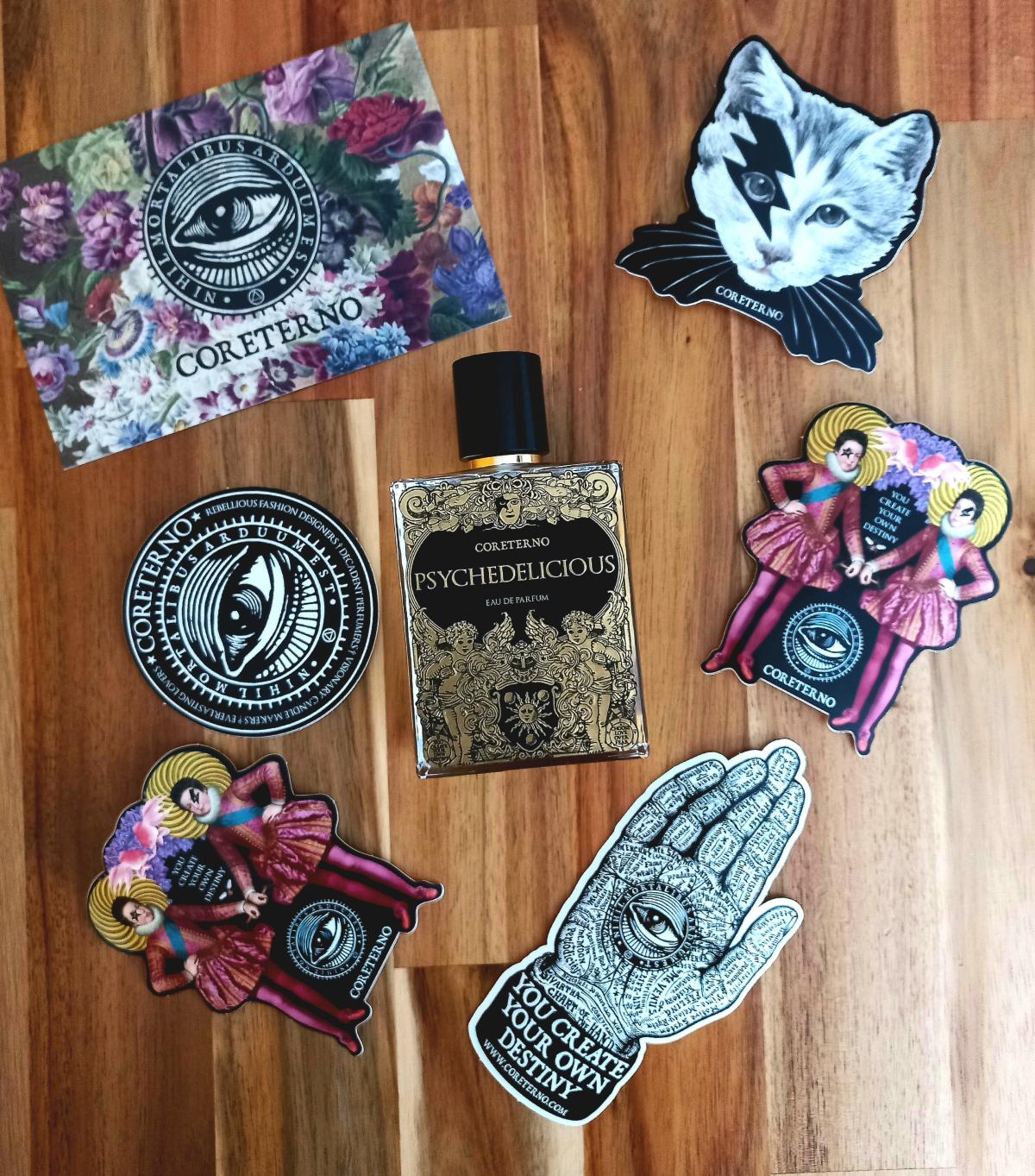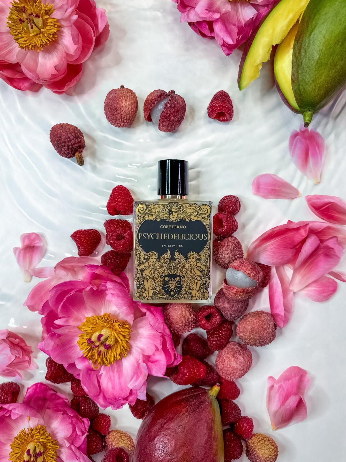 Psychedelicious podle Coreterno je Floral Fruity vůně pro ženy a muže. Psychedelicious byl/a uveden/a v roce 2023. "Nosem" za touto vůní je Arturetto Landi. Vrchní tóny jsou Černý rybíz, Liči, Maliny, Mango, Grapefruit, Růžový pepř a Muškátový oříšek; střední tóny jsouPivoňka, Růže a Magnólie ; základní tóny jsou Vanilka, Vetiver, Jantar (ambra) a Santalové dřevo.