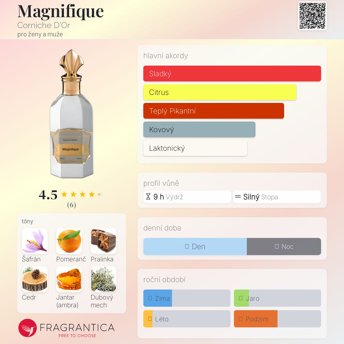 Magnifique podle Corniche D'Or je vůně pro ženy a muže. Magnifique byl/a uveden/a v roce 2023. "Nosem" za touto vůní je Karine Vinchon Spehner. Vrchní tóny jsou Šafrán a Pomeranč; střední tóny jsouPralinka a Cedr ; základní tóny jsou Dubový mech a Jantar (ambra).