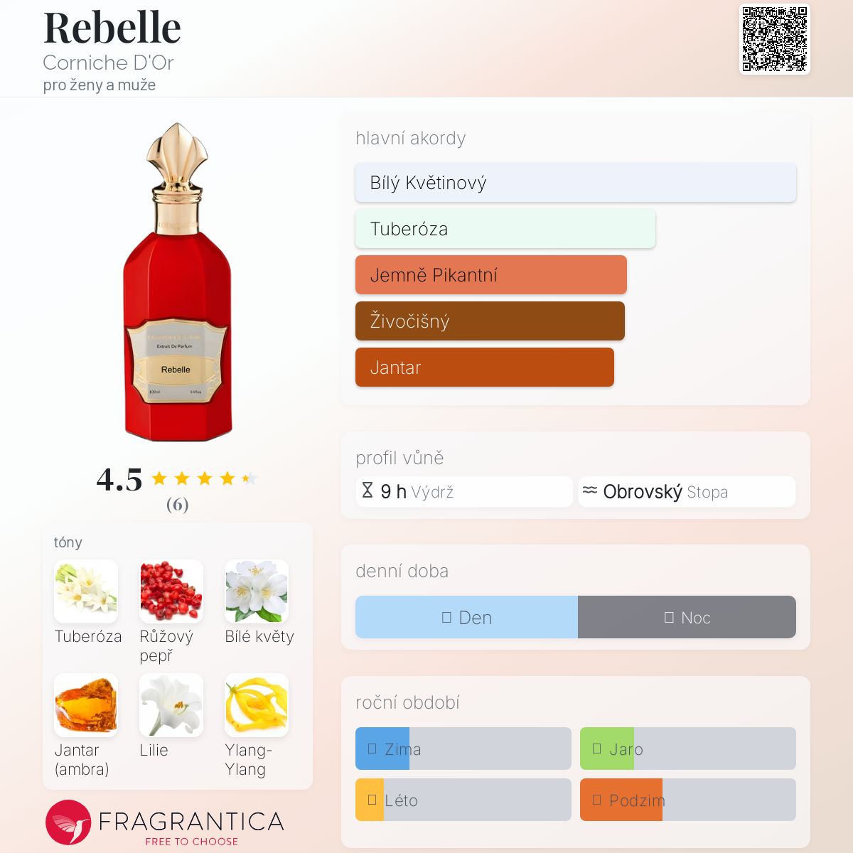 Rebelle podle Corniche D'Or je Floral vůně pro ženy a muže. Rebelle byl/a uveden/a v roce 2023. "Nosem" za touto vůní je Emilie Bouge. Vrchní tóny jsou Tuberóza a Růžový pepř; střední tóny jsouBílé květy, Ylang-Ylang a Pryskyřičné tóny ; základní tóny jsou Jantar (ambra), Lilie a Pižmo.