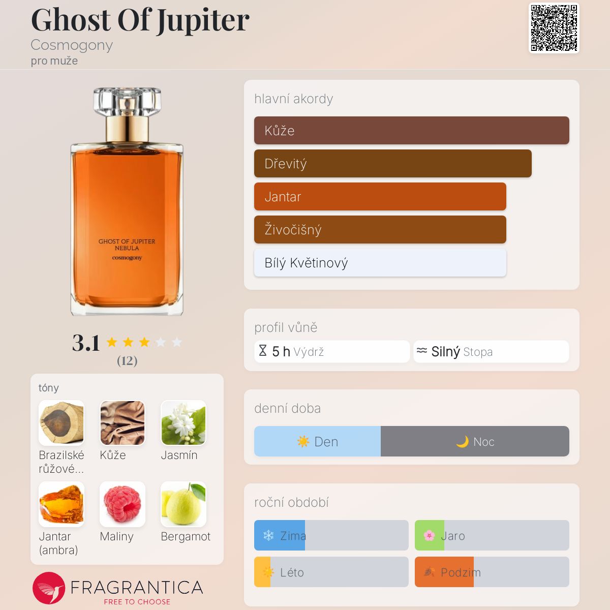 Ghost Of Jupiter podle Cosmogony je Orientální Woody vůně pro muže. Toto je nová vůně. Ghost Of Jupiter byl/a uveden/a v roce 2024. "Nosem" za touto vůní je Marine Ipert. Vrchní tóny jsou Bergamot a Zelené listí; střední tóny jsouBrazilské růžové dřevo, Kůže, Jasmín a Maliny ; základní tóny jsou Jantar (ambra), Dřevité tóny, Cedr, Pižmo a Vetiver.