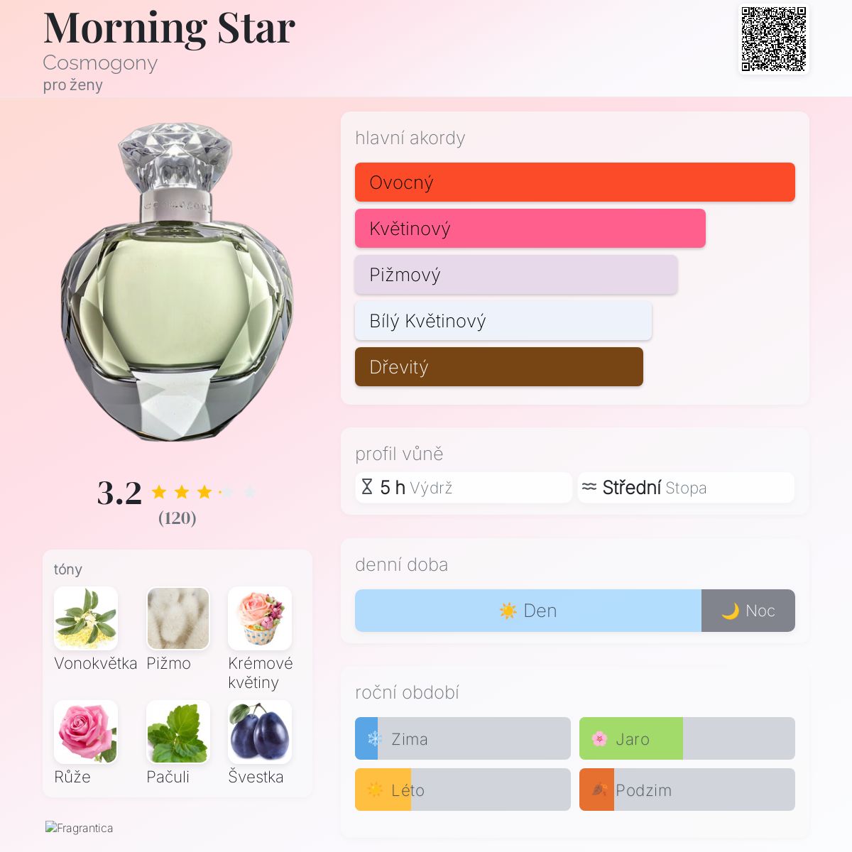 Morning Star podle Cosmogony je Floral Fruity vůně pro ženy. Morning Star byl/a uveden/a v roce 2022. "Nosem" za touto vůní je Angéline Leporini. Vrchní tóny jsou Švestka, Ostružina a Mandarinka; střední tóny jsouVonokvětka, Krémové květiny, Růže, Jasmín a Tuberóza ; základní tóny jsou Pižmo, Pačuli, Santalové dřevo a Ambra.
