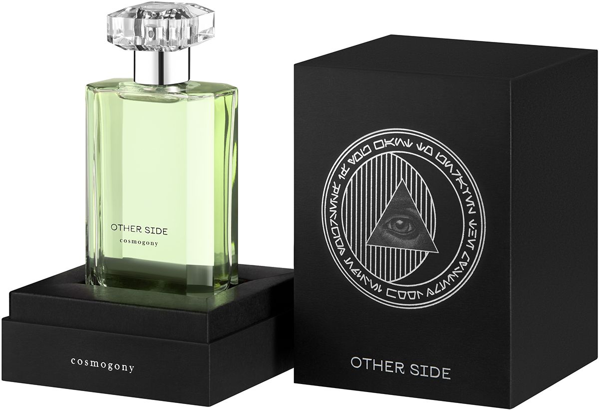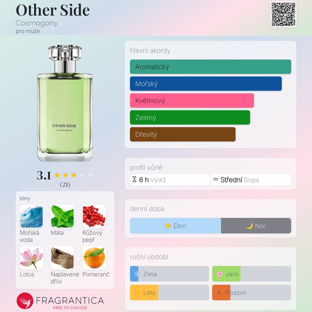 Other Side podle Cosmogony je Aromatic Green vůně pro muže. Other Side byl/a uveden/a v roce 2023. "Nosem" za touto vůní je Felix Deschamp. Vrchní tóny jsou Máta, Růžový pepř, Sladký pomeranč, Kardamom a Meloun; střední tóny jsouMořská voda, Lotus, Pomerančový květ, Frézie, Aldehydy, Pivoňka, Růže, Mimóza, Fialka, Kosatec a Liči ; základní tóny jsou Naplavené dříví, Dubový mech, Vetiver a Jantar (ambra).