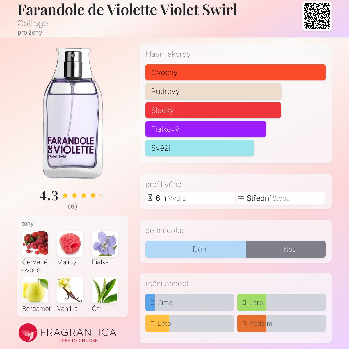 Farandole de Violette Violet Swirl podle Cottage je Floral Fruity vůně pro ženy. Farandole de Violette Violet Swirl byl/a uveden/a v roce 2016. Vrchní tóny jsou Červené ovoce, Malinový list a Bergamot; střední tóny jsouFialka, Čaj a Růže ; základní tóny jsou Vanilka, Bílé pižmo a Santalové dřevo.