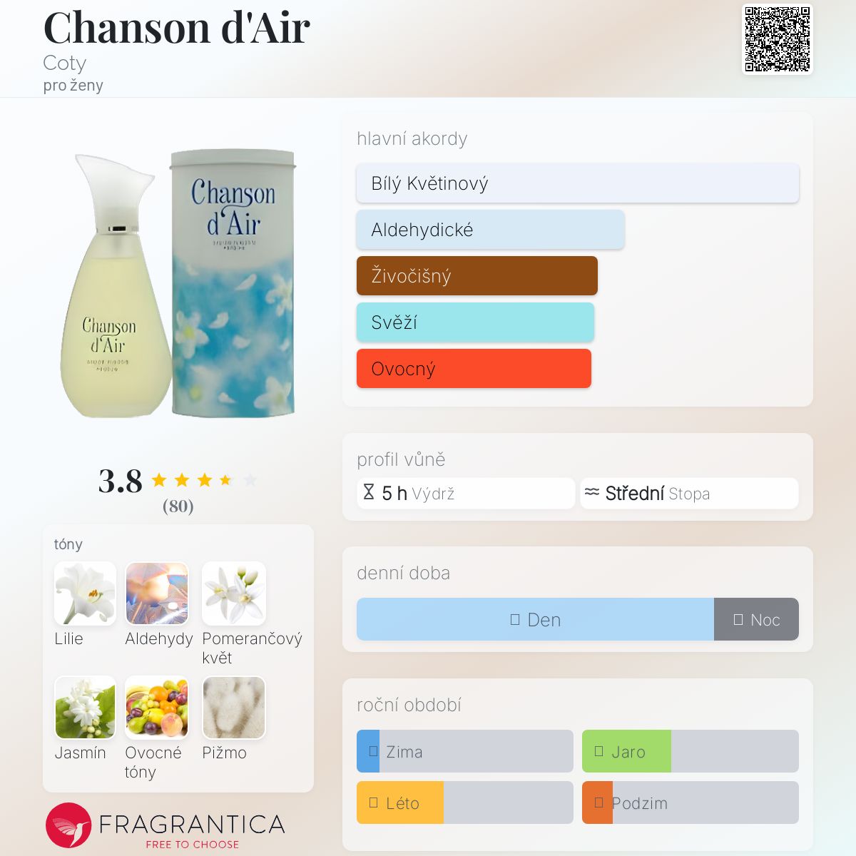 Chanson d'Air podle Coty je Floral vůně pro ženy. Chanson d'Air byla spuštěna během 1990. Vrchní tóny jsou Aldehydy, Pomerančový květ a Ovocné tóny; střední tóny jsouLilie, Jasmín a Tuberóza ; základní tóny jsou Pižmo, Santalové dřevo a Jantar (ambra).