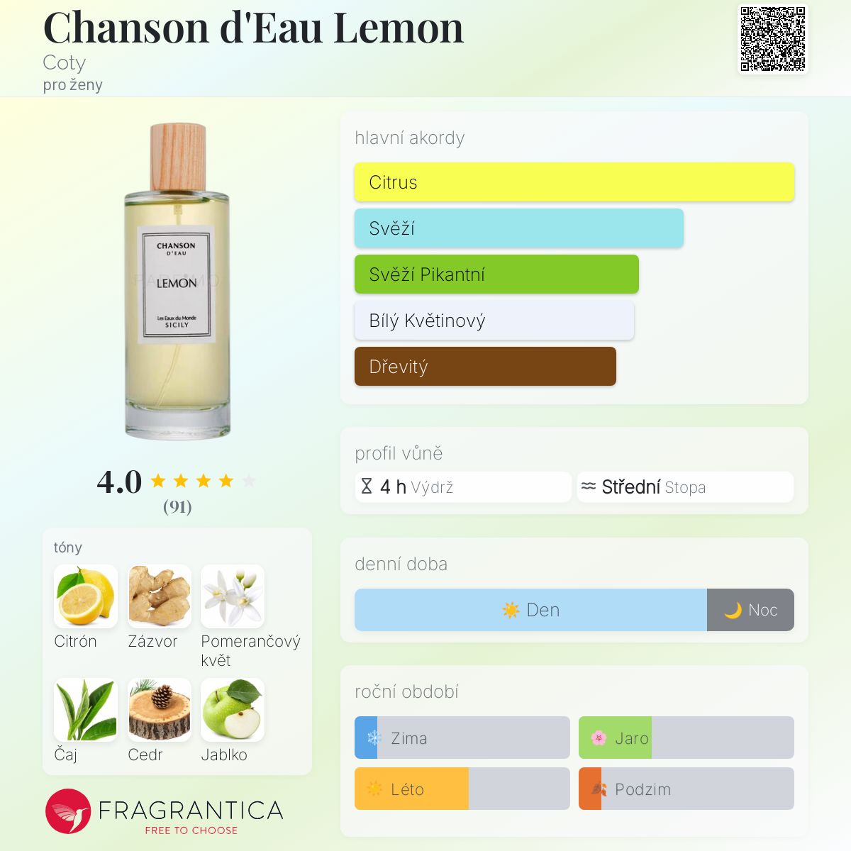 Chanson d'Eau Lemon podle Coty je vůně pro ženy. Chanson d'Eau Lemon byl/a uveden/a v roce 2024. Vrchní tóny jsou Citrón a Zázvor; střední tóny jsouPomerančový květ, Zelený čaj a Jablko ; základní tóny jsou Cedr a Jantar (ambra).