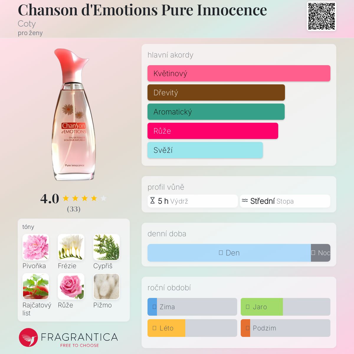 Chanson d'Emotions Pure Innocence podle Coty je Floral Green vůně pro ženy. Chanson d'Emotions Pure Innocence byla spuštěna během 2000. Vrchní tóny jsou Cypřiš a Rajčatový list; střední tóny jsouPivoňka, Frézie, Růže a Ylang-Ylang ; základní tóny jsou Pižmo a Santalové dřevo.