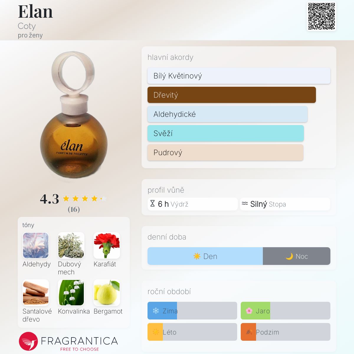 Elan podle Coty je Floral Aldehyde vůně pro ženy. Elan byl/a uveden/a v roce 1968. Vrchní tóny jsou Aldehydy, Bergamot a Zelené tóny; střední tóny jsouKarafiát, Konvalinka, Orris, Jasmín, Damašská růže a Gardénie ; základní tóny jsou Dubový mech, Santalové dřevo, Pižmo, Cibetka, Labdanum, Fazole tonka, Pačuli, Ambra, Mahagon a Cedr.