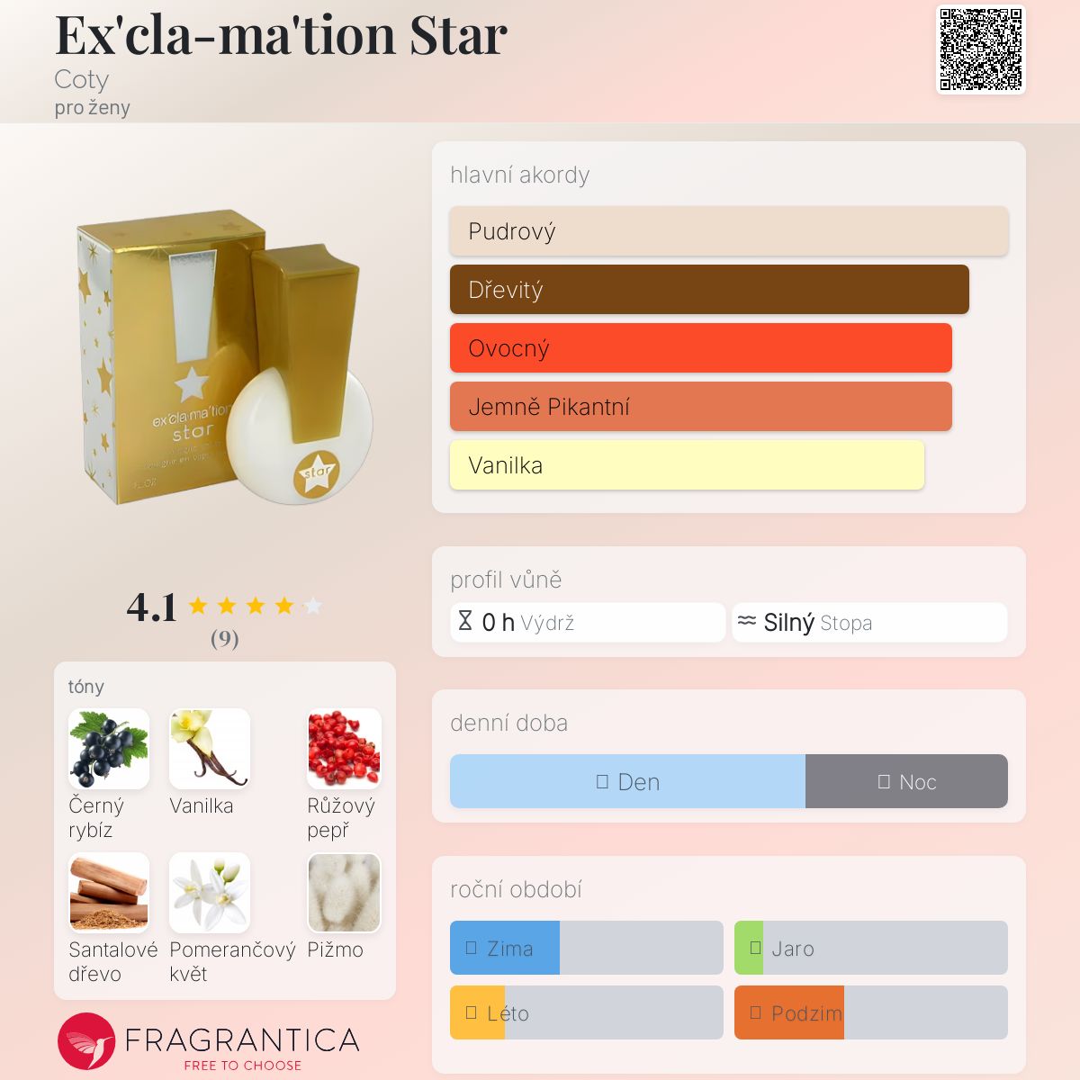 Ex'cla-ma'tion Star podle Coty je Floral Woody Musk vůně pro ženy. Ex'cla-ma'tion Star byl/a uveden/a v roce 2005. Vrchní tóny jsou Černý rybíz a Pomerančový květ; střední tóny jsouRůžový pepř a Fialka ; základní tóny jsou Vanilka, Santalové dřevo a Pižmo.