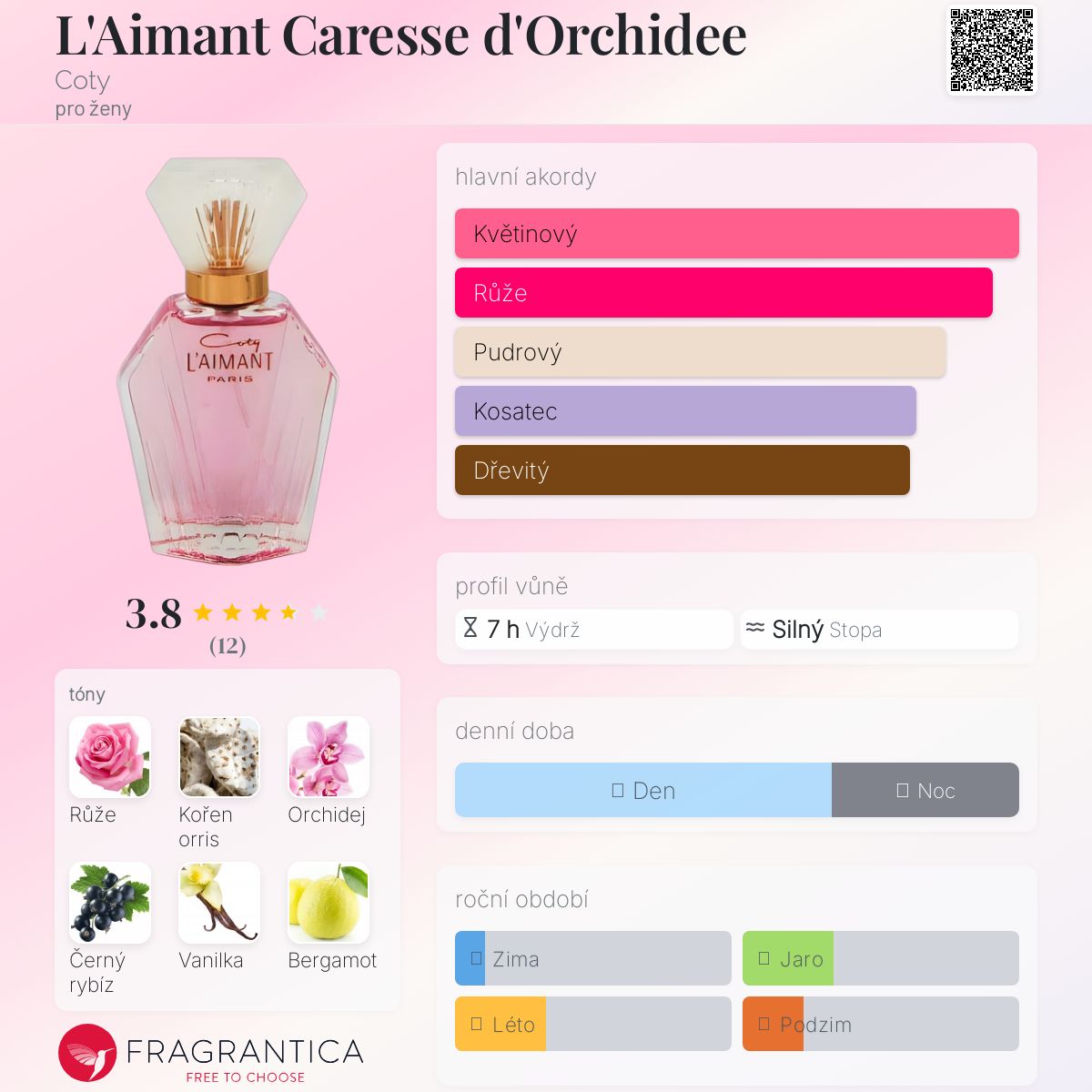 L'Aimant Caresse d'Orchidee podle Coty je Floral vůně pro ženy. L'Aimant Caresse d'Orchidee byl/a uveden/a v roce 2006. L'Aimant Caresse d'Orchidee byl/a vytvořen/a Philippe Roques a Christophe Raynaud. Vrchní tóny jsou Černý rybíz, Bergamot a Pomerančový květ; střední tóny jsouČervená růže, Okvětní lístky růží, Orris, Orchidej, Jasmín, Hyacint, Lilie a Ylang-Ylang ; základní tóny jsou Vanilka, Santalové dřevo, Dubový mech a Vetiver.