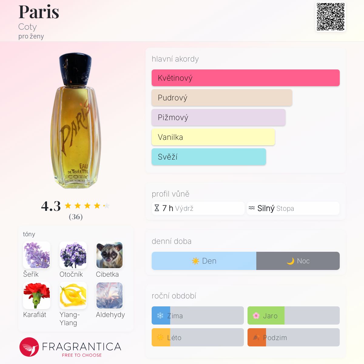 Paris podle Coty je Floral vůně pro ženy. Paris byl/a uveden/a v roce 1923. "Nosem" za touto vůní je Francois Coty.