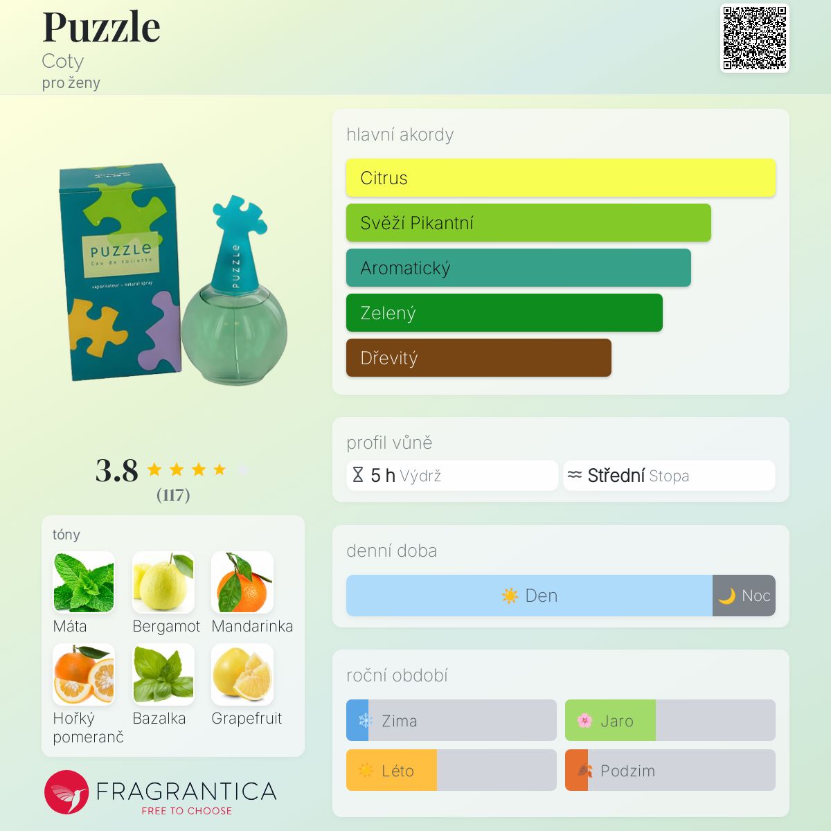 Puzzle podle Coty je Citrus vůně pro ženy. Puzzle byl/a uveden/a v roce 1997. Vrchní tóny jsou Bergamot, Mandarinka, Hořký pomeranč, Bazalka, Grapefruit a Červené jablko; střední tóny jsouMáta, Cypřiš a Ibišek ; základní tóny jsou Pižmo, Cedr a Jantar (ambra).