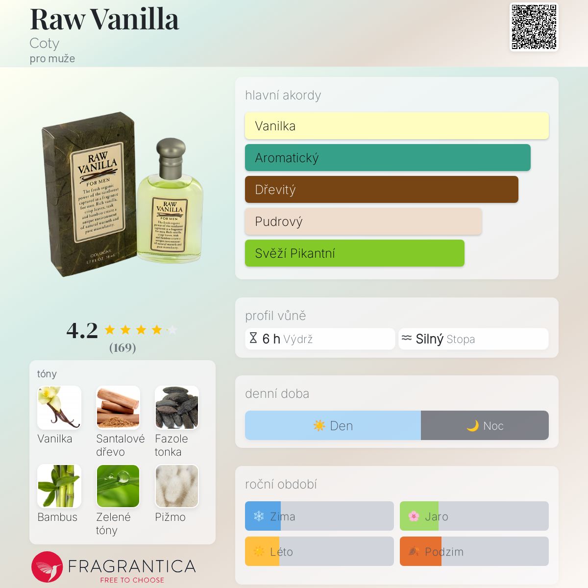 Raw Vanilla podle Coty je Orientální vůně pro muže. Vrchní tóny jsou Vanilka, Zelené listí a Bergamot; střední tóny jsouJalovcové bobulky, Šalvěj muškátová, Pelargónie, Leknín a Orchidej ; základní tóny jsou Vanilka, Santalové dřevo, Fazole tonka, Bambus a Pižmo.
