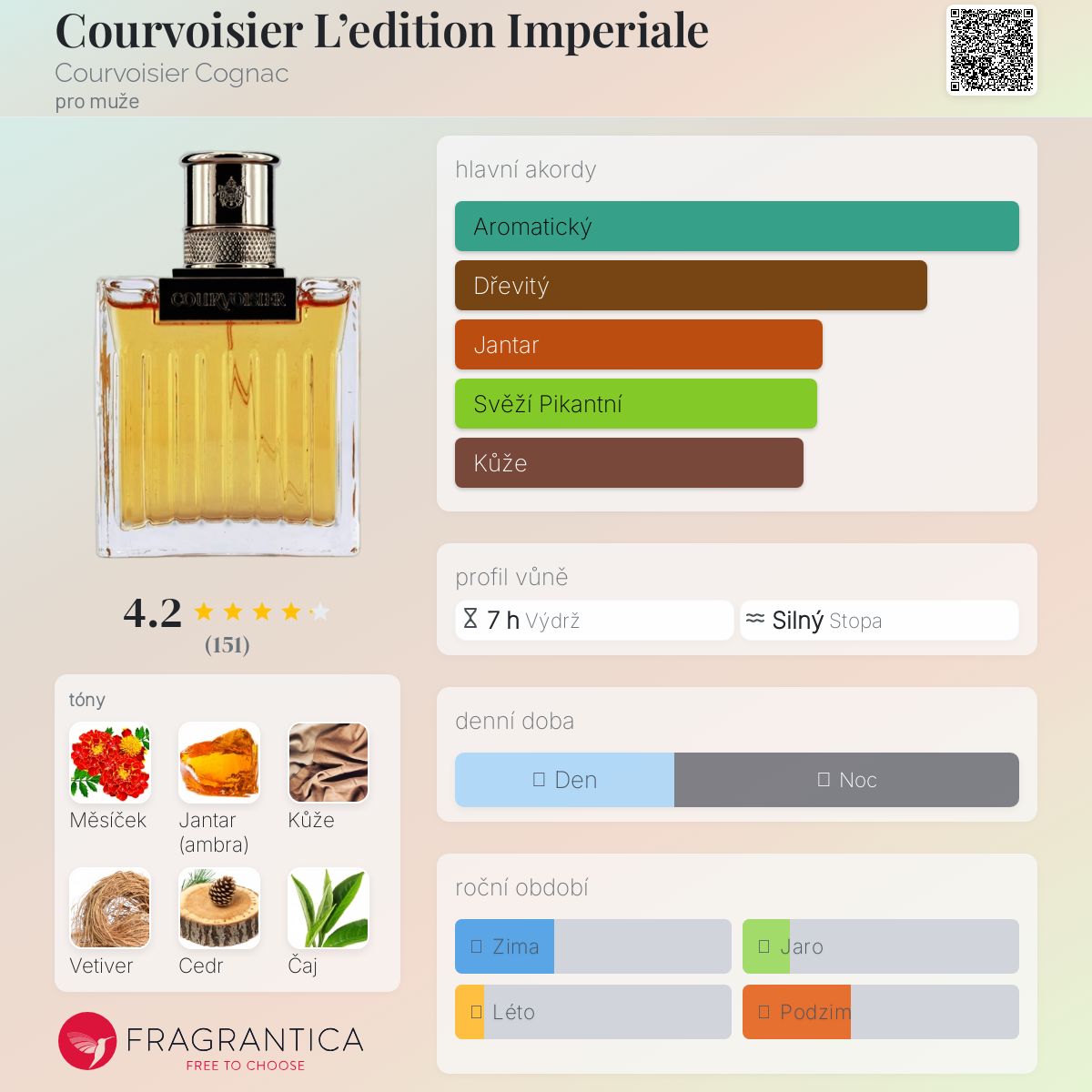 Courvoisier L’edition Imperiale podle Courvoisier Cognac je Orientální Woody vůně pro muže. Courvoisier L’edition Imperiale byl/a uveden/a v roce 2006. "Nosem" za touto vůní je Alexis Dadier. Vrchní tóny jsou Aksamitník, Koriandr, Kardamom a Mandarinka; střední tóny jsouAtlasový cedr, Čaj, Arum lilie a Fialka ; základní tóny jsou Jantar (ambra), Kůže, Vetiver a Jedle balzámová.