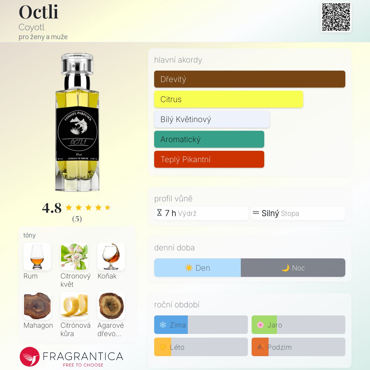 Octli podle Coyotl je Woody Aromatic vůně pro ženy a muže. Toto je nová vůně. Octli byl/a uveden/a v roce 2024. "Nosem" za touto vůní je Aneberg Prz Lui. Vrchní tóny jsou Rum, Citronový květ, Petitgrain, Neroli a Bergamot; střední tóny jsouKoňak, Citrónová kůra, Damašská růže, Tráva a Jalovec ; základní tóny jsou Mahagon, Agarové dřevo (oud), Santalové dřevo a Dubový mech.