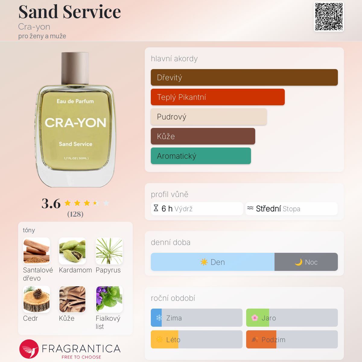Sand Service podle Cra-yon je Orientální Woody vůně pro ženy a muže. Sand Service byl/a uveden/a v roce 2020. Vrchní tóny jsou Kardamom a Fialkový list; střední tóny jsouPapyrus a Orris ; základní tóny jsou Santalové dřevo, Cedr, Kůže a Jantar (ambra).