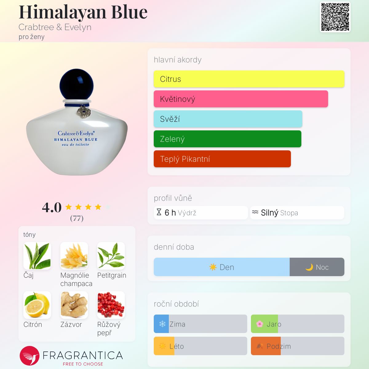 Himalayan Blue podle Crabtree & Evelyn je Chypre Floral vůně pro ženy. Himalayan Blue byl/a uveden/a v roce 2012. Vrchní tóny jsou Pomerančový list, Citrón a Mandarinka; střední tóny jsouČerný čaj, Žlutá champaca, Zázvor, Růžový pepř, Polní květiny a Růže ; základní tóny jsou Santalové dřevo, Kůže a Pačuli.