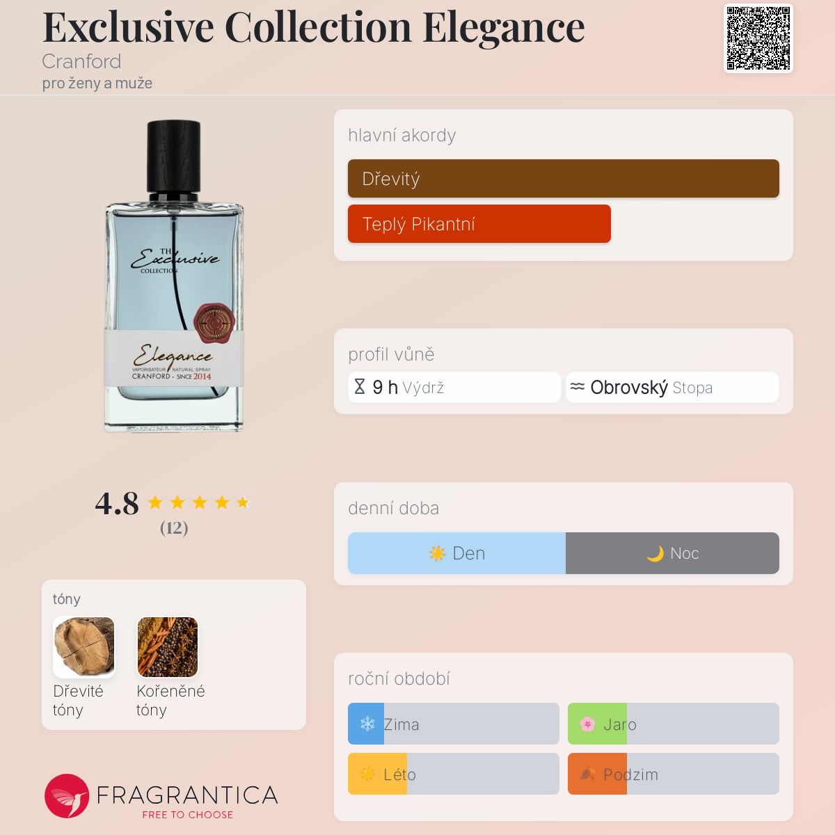 Exclusive Collection Elegance podle Cranford je Woody Spicy vůně pro ženy a muže. Exclusive Collection Elegance byl/a uveden/a v roce 2023. střední tón jeDřevité tóny ; základní tón je Kořeněné tóny.