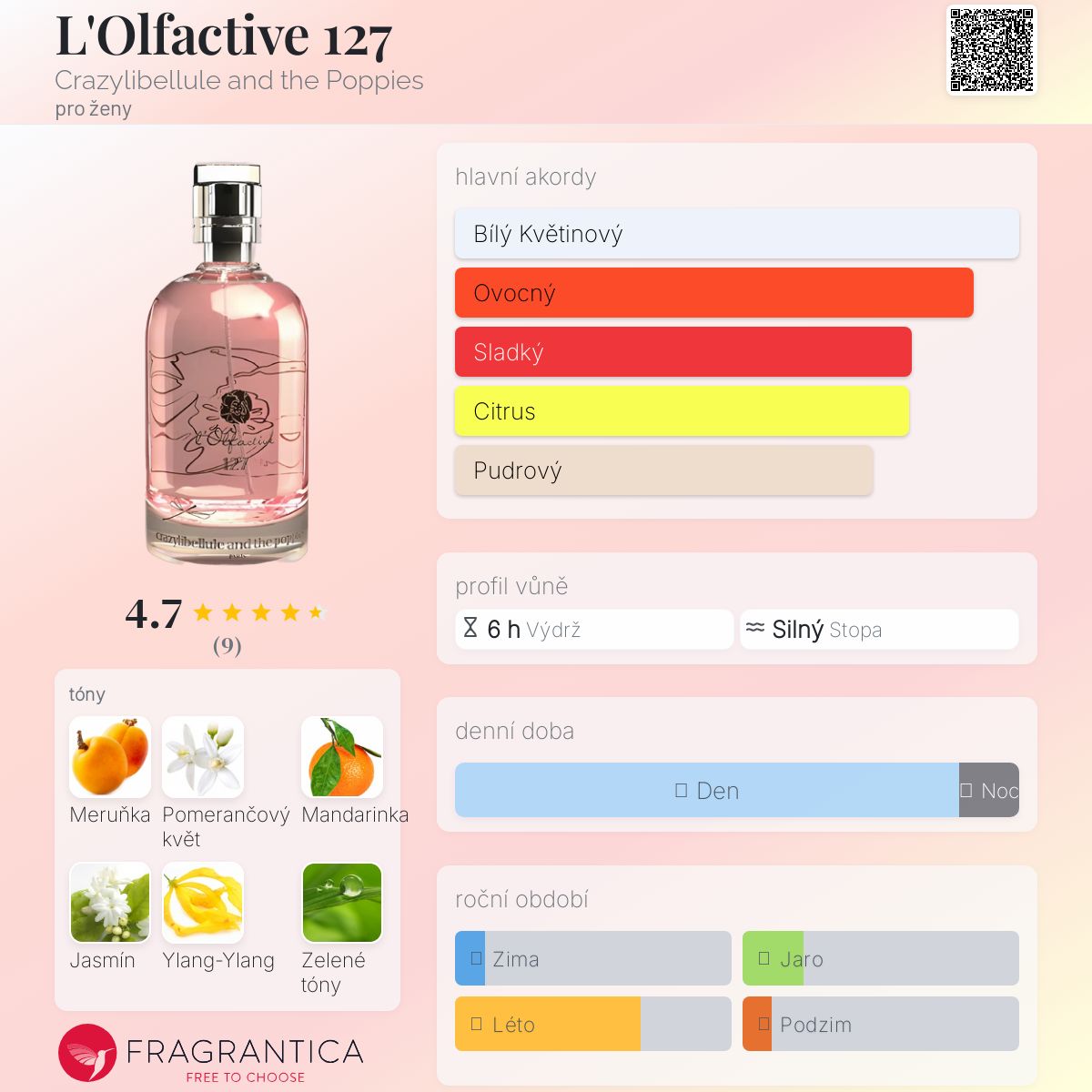 L'Olfactive 127 podle Crazylibellule and the Poppies je Floral Fruity vůně pro ženy. L'Olfactive 127 byl/a uveden/a v roce 2007. "Nosem" za touto vůní je Sonia Constant. Vrchní tóny jsou Meruňka, Mandarinka a Zelené listí; střední tóny jsouPomerančový květ, Jasmín, Ylang-Ylang a Růže ; základní tóny jsou Santalové dřevo a Pižmo.