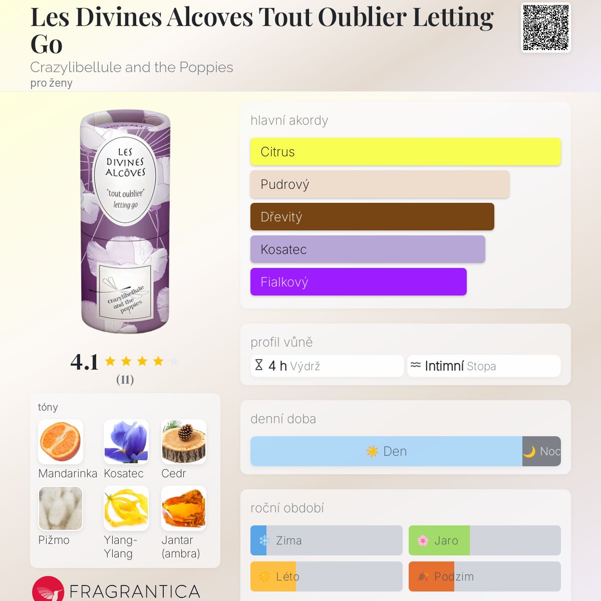 Les Divines Alcoves Tout Oublier Letting Go podle Crazylibellule and the Poppies je Floral Woody Musk vůně pro ženy.