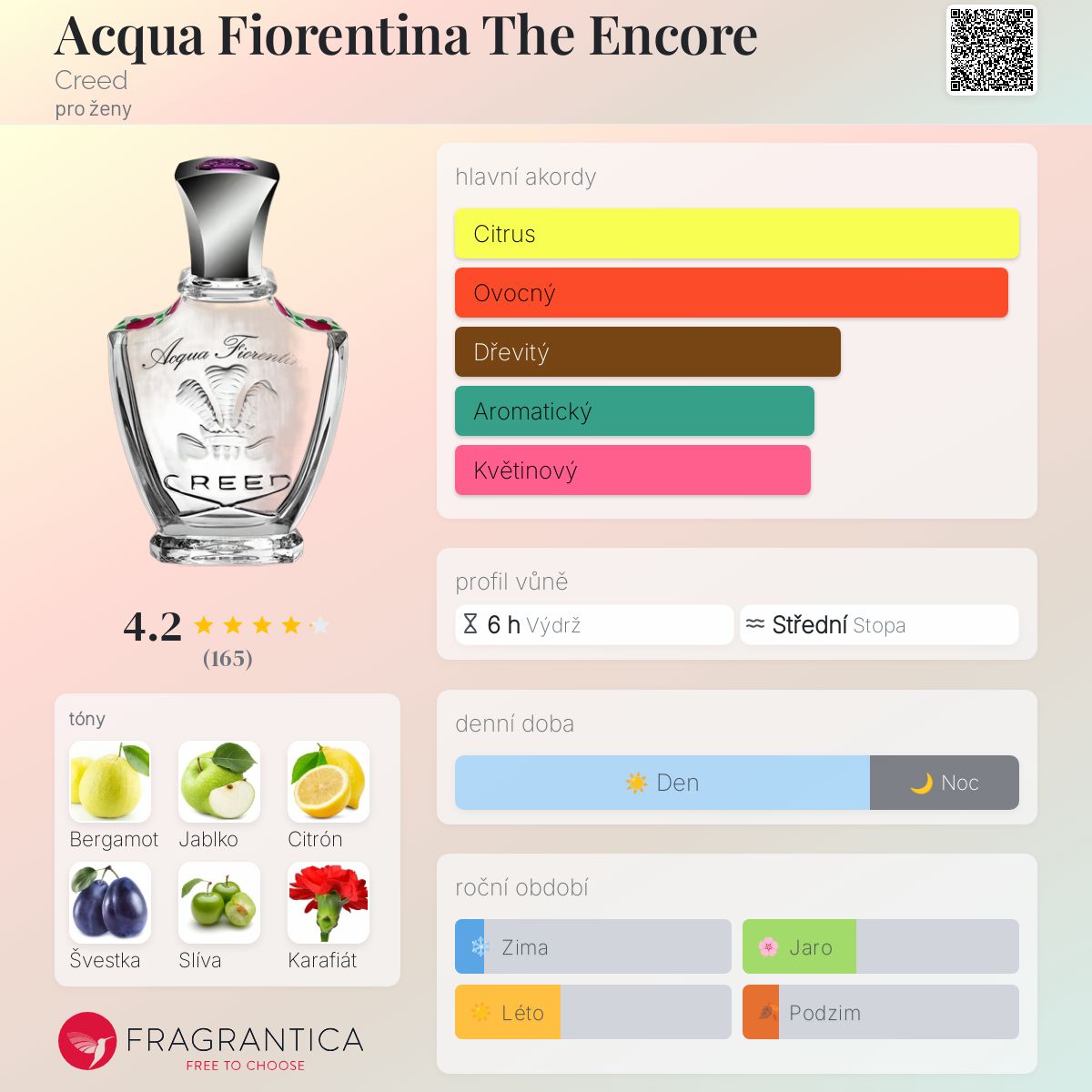 Acqua Fiorentina The Encore podle Creed je Floral Fruity vůně pro ženy. Acqua Fiorentina The Encore byl/a uveden/a v roce 2012. "Nosem" za touto vůní je Olivier Creed. Vrchní tóny jsou Jablko, Švestka, Slíva a Černohlávek; střední tóny jsouBergamot, Citrón, Karafiát, Růže a Hruška ; základní tóny jsou Cedr, Santalové dřevo a Grapefruit.