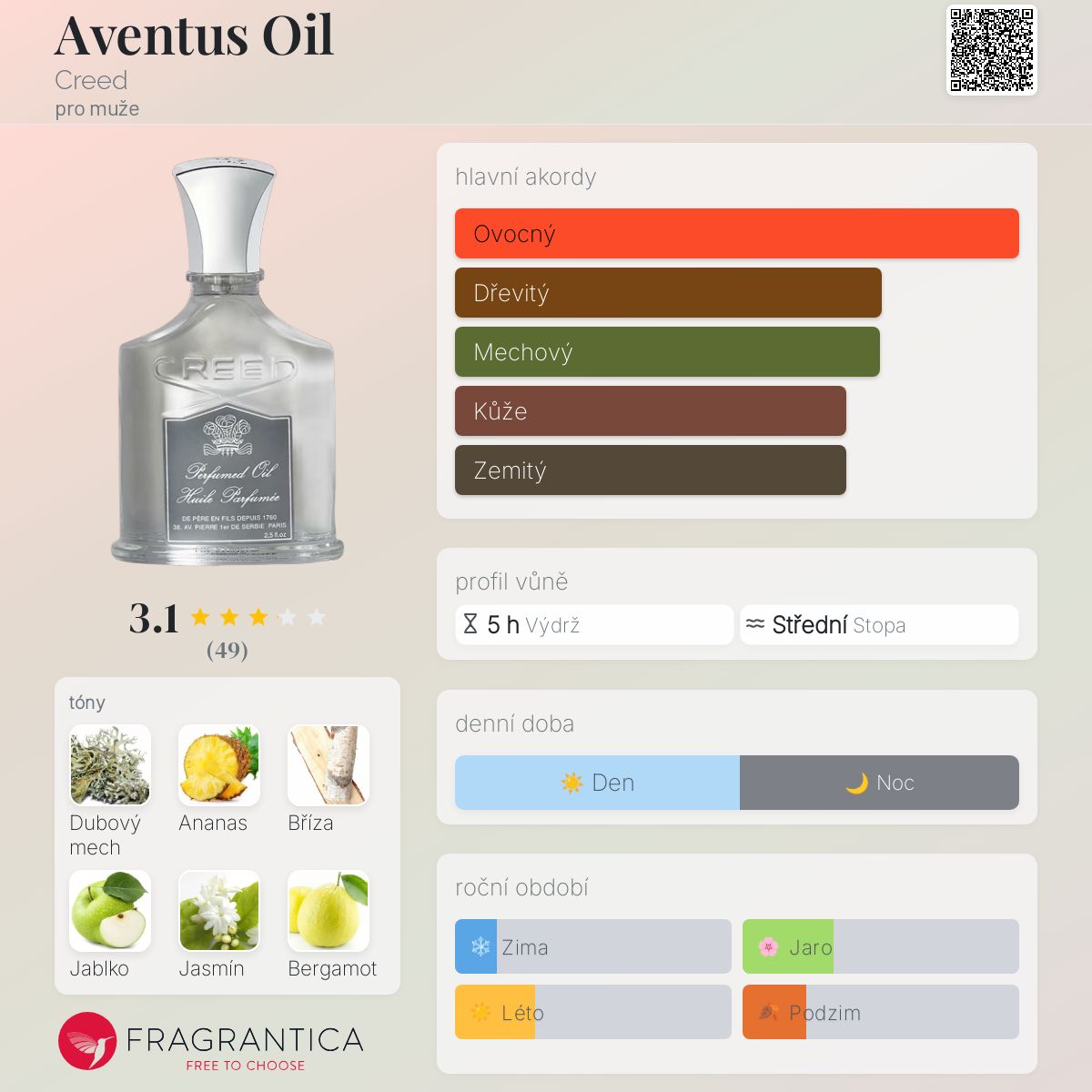 Aventus Oil podle Creed je Aromatic Fruity vůně pro muže. Aventus Oil byl/a uveden/a v roce 2021. Vrchní tóny jsou Ananas, Jablko, Bergamot a Černý rybíz; střední tóny jsouBříza, Jasmín, Pačuli a Růže ; základní tóny jsou Dubový mech, Ambra, Pižmo a Vanilka.