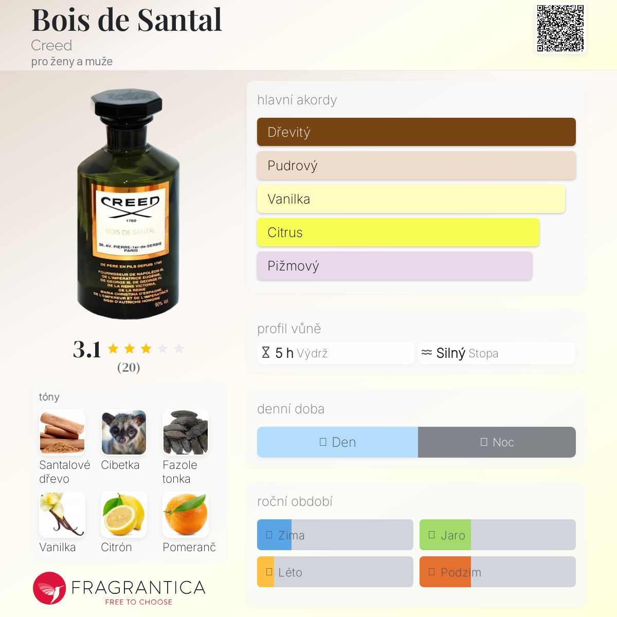 Bois de Santal podle Creed je Woody Aromatic vůně pro ženy a muže. Bois de Santal byla spuštěna během 2000. Vrchní tóny jsou Cibetka, Citrón, Pomeranč a Zelené tóny; střední tón jeSantalové dřevo ; základní tóny jsou Santalové dřevo, Fazole tonka a Vanilka.