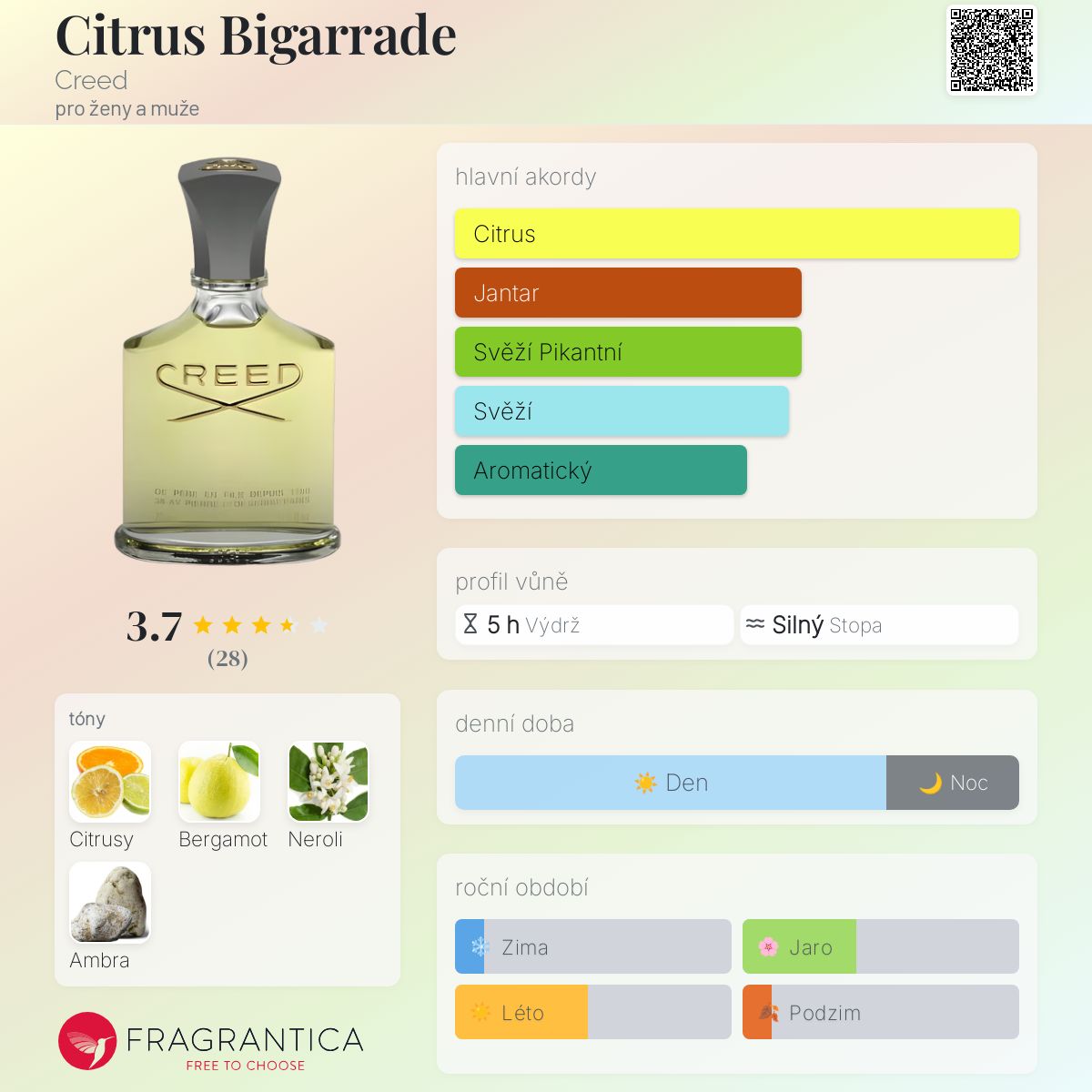 Citrus Bigarrade podle Creed je Citrus vůně pro ženy a muže. Citrus Bigarrade byl/a uveden/a v roce 1901. "Nosem" za touto vůní je Henry Creed Fourth Generation. Vrchní tóny jsou Citrusy a Bergamot; střední tón jeNeroli ; základní tón je Ambra.