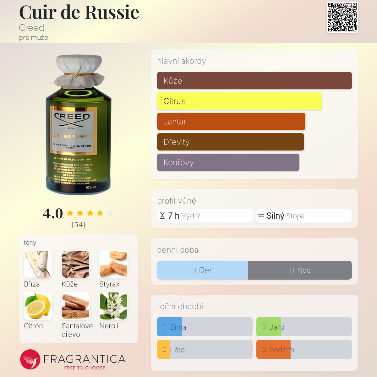 Cuir de Russie podle Creed je Woody Aromatic vůně pro muže. Cuir de Russie byl/a uveden/a v roce 1953. "Nosem" za touto vůní je James Henry Creed.