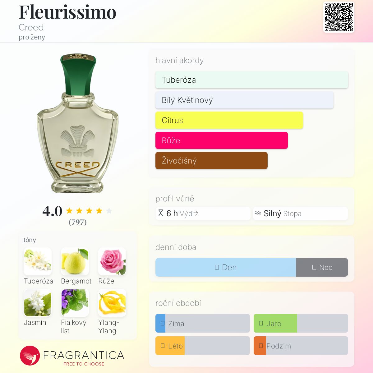 Fleurissimo podle Creed je Floral vůně pro ženy. Fleurissimo byl/a uveden/a v roce 1956. "Nosem" za touto vůní je James Henry Creed. Vrchní tóny jsou Bergamot, Fialkové listy a Mandarinka; střední tóny jsouTuberóza, Růže, Jasmín, Ylang-Ylang a Neroli ; základní tóny jsou Orris, Cedr a Santalové dřevo.