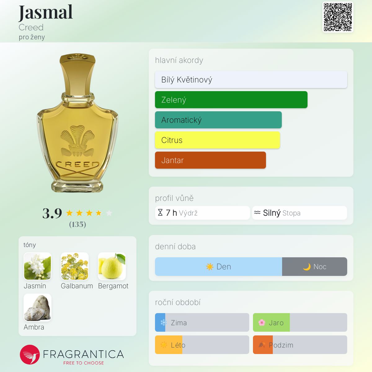 Jasmal podle Creed je Floral vůně pro ženy. Jasmal byl/a uveden/a v roce 1959. "Nosem" za touto vůní je James Henry Creed. Vrchní tón je Bergamot ; střední tóny jsouItalský jasmín a Marocký jasmín ; základní tóny jsou Galbanum a Ambra.