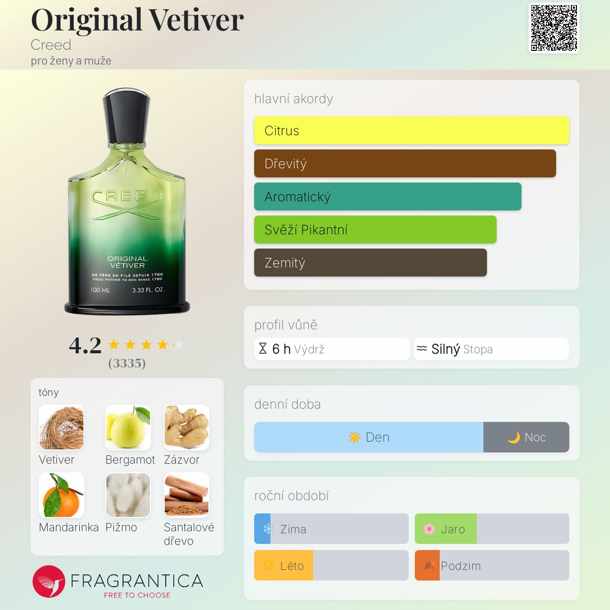 UPD Znovu poslechnuto ještě několikrát za jiného počasí. Chtěla bych dodat, že v základu je teplejší než na začátku, více dřevitá. S lehkým oříškovým a zemitým akcentem vetiveru, ale přechází spíše do kulatosti než do plné zemitosti či bohatosti. Moderní vetiver, který vyrostl z klasiky, s narovnaným profilem do hladkého zvuku bez větších výkyvů. Není příliš hlasitý, ale s vytrvalostí nejsou žádné problémy, pod 12 hodin. Možná trochu drahá cenovka, nic nového, ale funguje dobře. A ta cena, to jsou Creedy, na ně se dá vždycky vybrat za plnou cenu.
