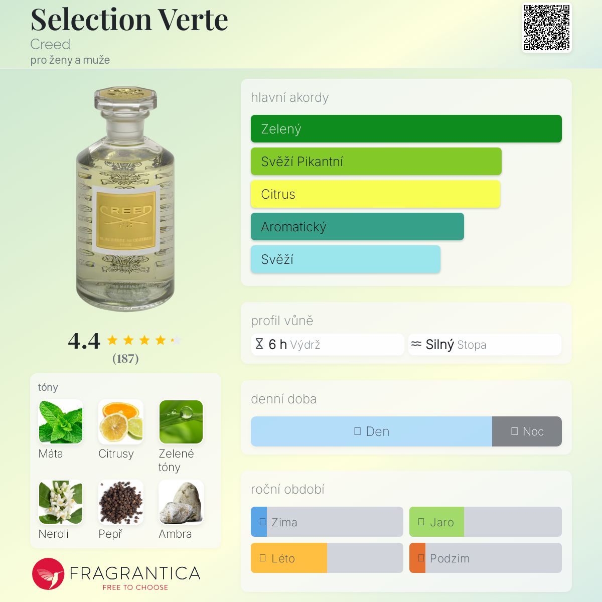 Selection Verte podle Creed je Citrus Aromatic vůně pro ženy a muže. Selection Verte byl/a uveden/a v roce 1901. "Nosem" za touto vůní je Henry Creed Fourth Generation. Vrchní tóny jsou Citrusy, Neroli a Pepř; střední tóny jsouMáta a Bylinné tóny ; základní tón je Ambra.