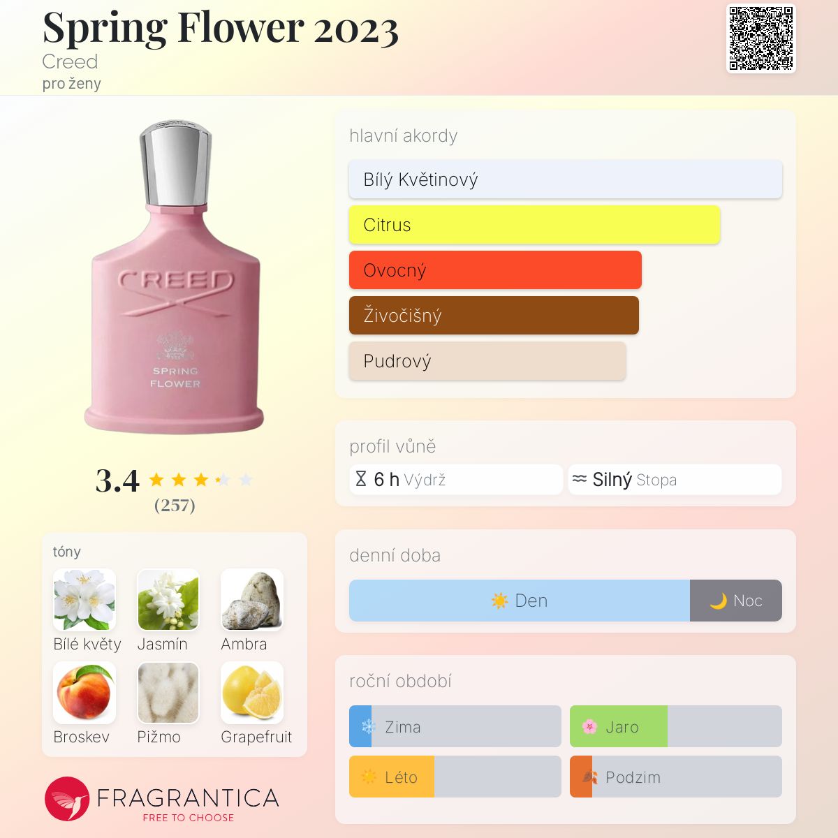 Spring Flower 2023 podle Creed je Floral Fruity vůně pro ženy. Spring Flower 2023 byl/a uveden/a v roce 2023. Vrchní tóny jsou Grapefruit, Citrón, Zelené tóny a Bergamot; střední tóny jsouBílé květy, Jasmín, Broskev a Meruňka ; základní tóny jsou Ambra, Pižmo a Cedr.