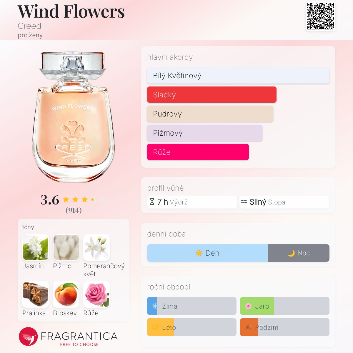 Wind Flowers podle Creed je Floral vůně pro ženy. Wind Flowers byl/a uveden/a v roce 2021. "Nosem" za touto vůní je Olivier Creed. Vrchní tóny jsou Jasmín, Pomerančový květ a Broskev; střední tóny jsouJasmín Sambac, Růže a Tuberóza ; základní tóny jsou Pižmo, Pomerančový květ, Pralinka, Kosatec a Santalové dřevo.