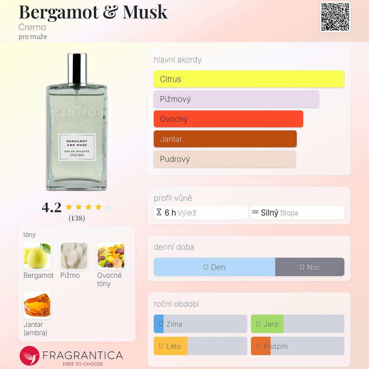 Bergamot & Musk podle Cremo je vůně pro muže. Bergamot & Musk byl/a uveden/a v roce 2017. Vrchní tón je Bergamot ; střední tón jeExotické ovoce ; základní tóny jsou Pižmo a Jantar (ambra).
