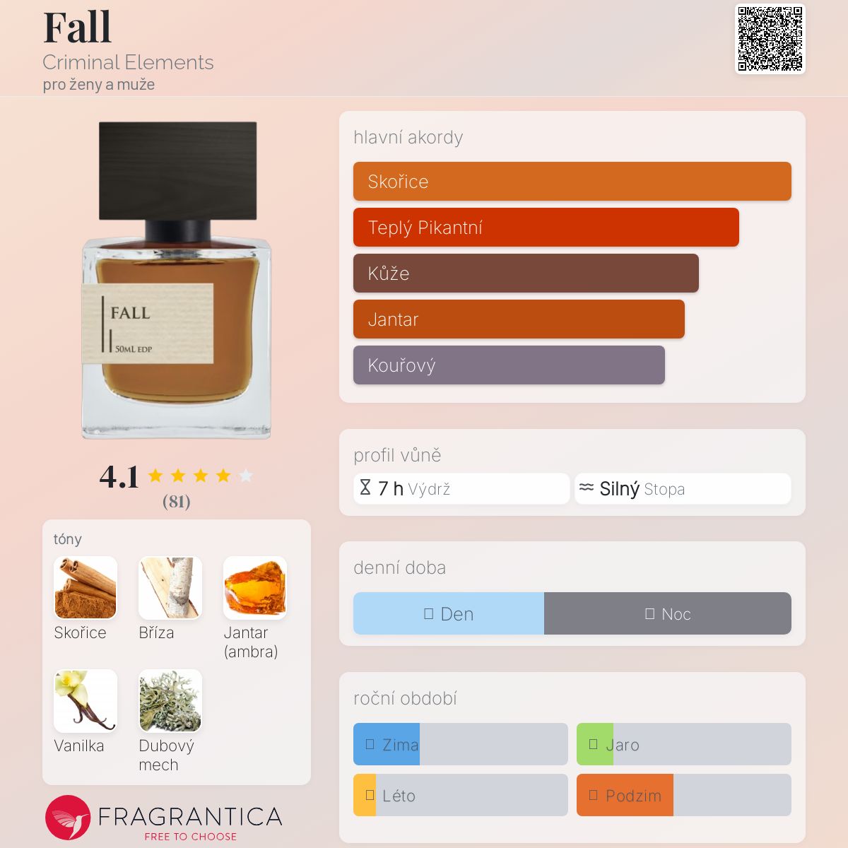 Fall podle Criminal Elements je Orientální Vanilla vůně pro ženy a muže. Fall byl/a uveden/a v roce 2019. "Nosem" za touto vůní je Corey Newcombe.