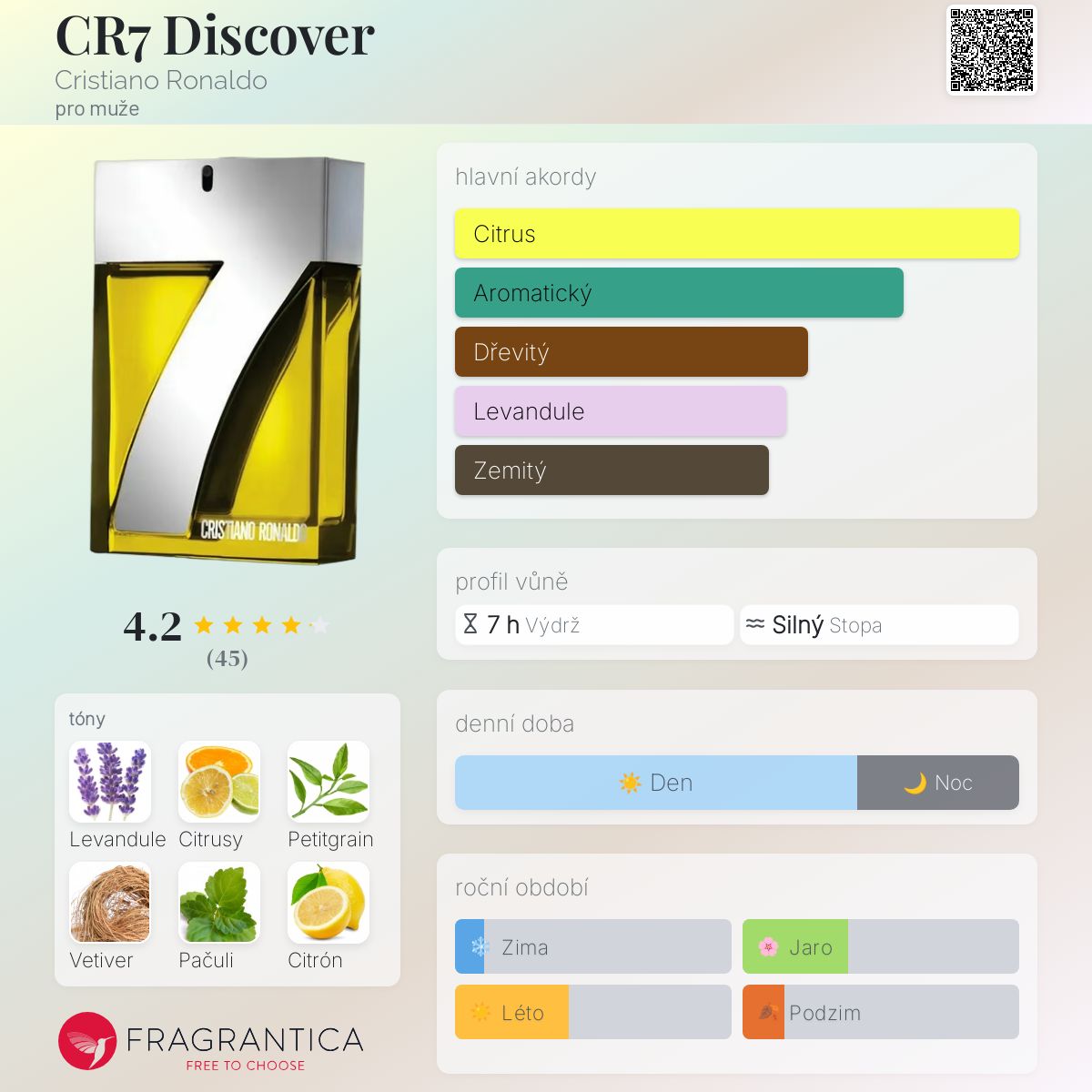 CR7 Discover podle Cristiano Ronaldo je Woody Aromatic vůně pro muže. Toto je nová vůně. CR7 Discover byl/a uveden/a v roce 2024. Vrchní tóny jsou Citrón, Pomeranč a Mandarinka; střední tóny jsouLevandule, Petitgrain a Šalvěj muškátová ; základní tóny jsou Citrusy, Vetiver a Pačuli.