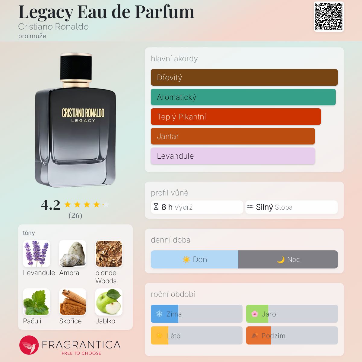 Legacy Eau de Parfum podle Cristiano Ronaldo je Woody Aromatic vůně pro muže. Toto je nová vůně. Legacy Eau de Parfum byl/a uveden/a v roce 2025. "Nosem" za touto vůní je Pierre Negrin. Vrchní tóny jsou Levandule, Skořice a Jablko; střední tóny jsouCedr, Šalvěj a Rozmarýn ; základní tóny jsou Ambra, Světlá dřeva a Pačuli.
