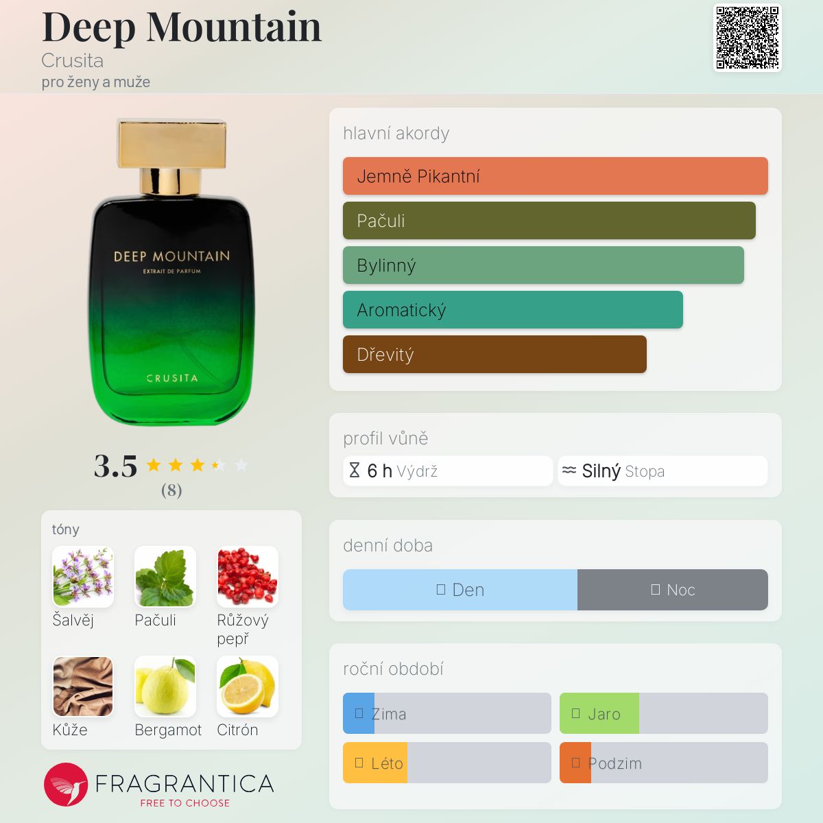 Deep Mountain podle Crusita je Woody Aromatic vůně pro ženy a muže. Deep Mountain byl/a uveden/a v roce 2022. "Nosem" za touto vůní je Alexandre Freile. Vrchní tóny jsou Růžový pepř, Bergamot a Citrón; střední tóny jsouŠalvěj, Kůže a Levandule ; základní tóny jsou Pačuli a Jantar (ambra).