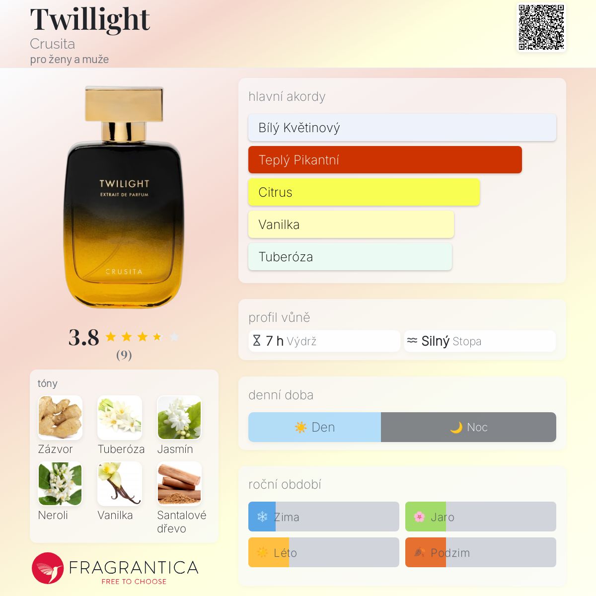 Twillight podle Crusita je Orientální Floral vůně pro ženy a muže. Twillight byl/a uveden/a v roce 2022. "Nosem" za touto vůní je Wessel-Jan Kos. Vrchní tóny jsou Zázvor, Pomeranč a Bergamot; střední tóny jsouTuberóza, Jasmín a Neroli ; základní tóny jsou Vanilka a Santalové dřevo.