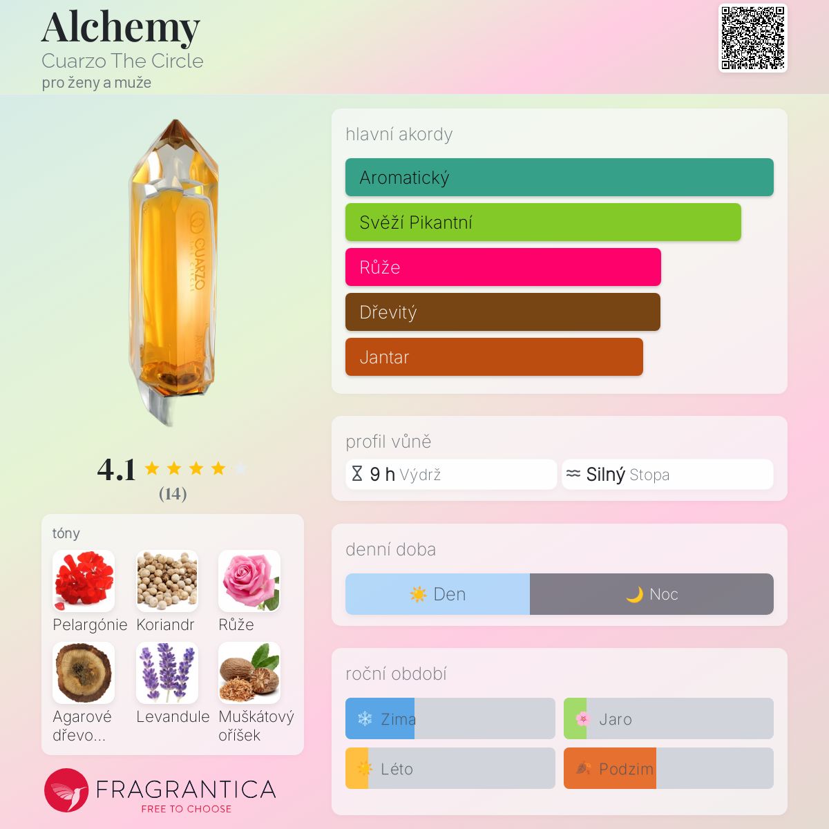 Alchemy podle Cuarzo The Circle je Orientální Woody vůně pro ženy a muže. Alchemy byl/a uveden/a v roce 2014. "Nosem" za touto vůní je Ramón Béjar. Vrchní tóny jsou Pelargónie, Koriandr, Levandule, Muškátový oříšek, Růžový pepř, Kardamom a Mandarinka; střední tóny jsouRůže, Agarové dřevo (oud), Jantar (ambra), Vetiver, Santalové dřevo, Magnólie, Fialka a Broskev ; základní tóny jsou Cedr, Benzoin a Pižmo.