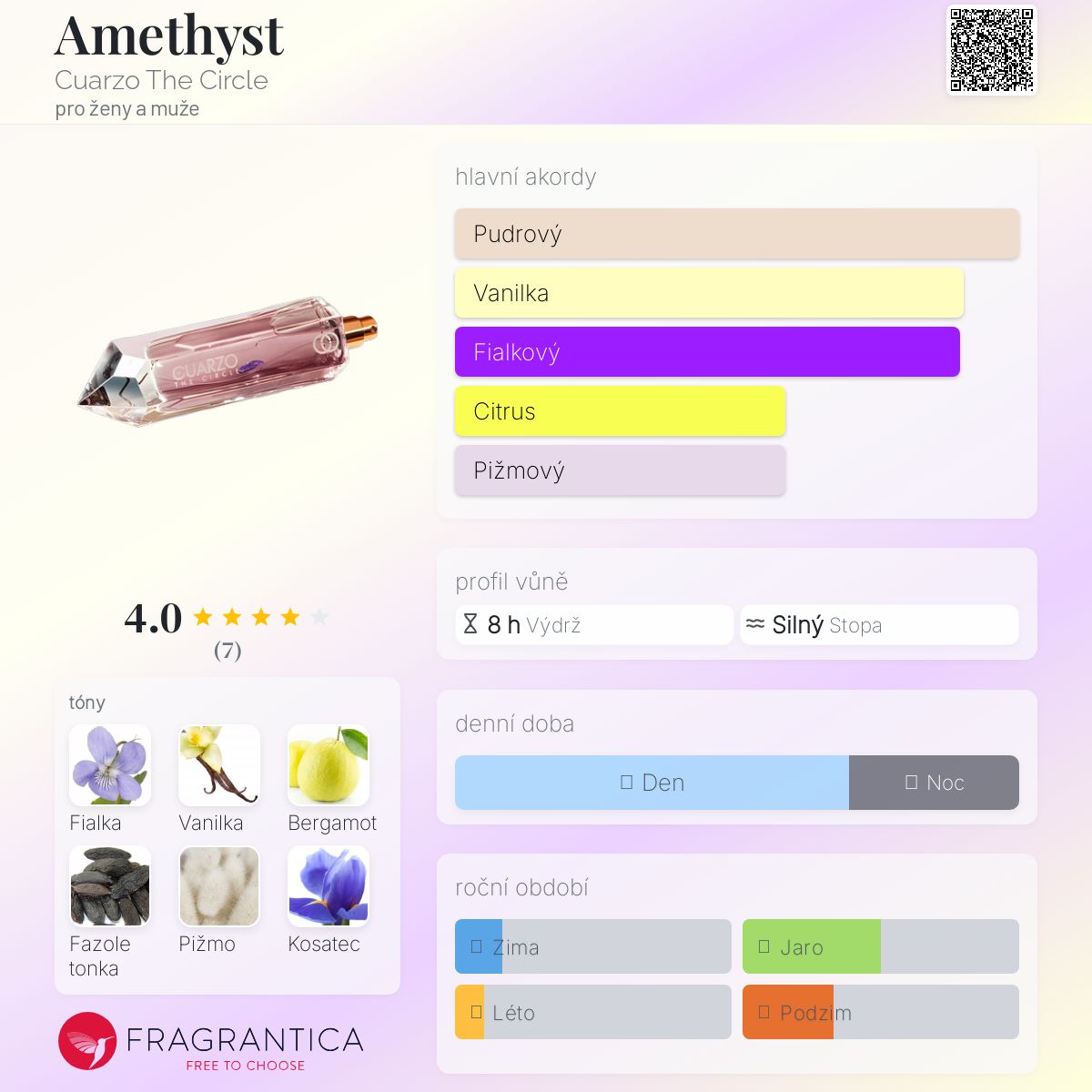 Amethyst podle Cuarzo The Circle je Chypre Floral vůně pro ženy a muže. "Nosem" za touto vůní je Ramón Béjar. Vrchní tóny jsou Bergamot a Kosatec; střední tóny jsouFialka, Jasmín a Růže ; základní tóny jsou Vanilka, Fazole tonka a Pižmo.