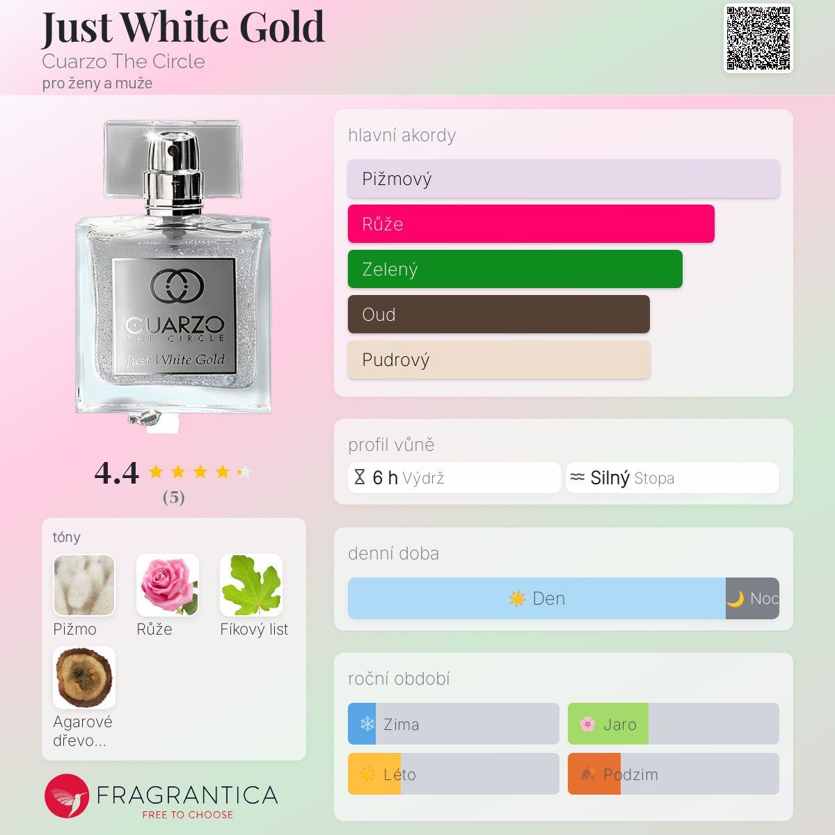 Just White Gold podle Cuarzo The Circle je Orientální Floral vůně pro ženy a muže. "Nosem" za touto vůní je Ramón Béjar. Vrchní tón je Fíkový list ; střední tón jeRůže ; základní tóny jsou Pižmo a Agarové dřevo (oud).