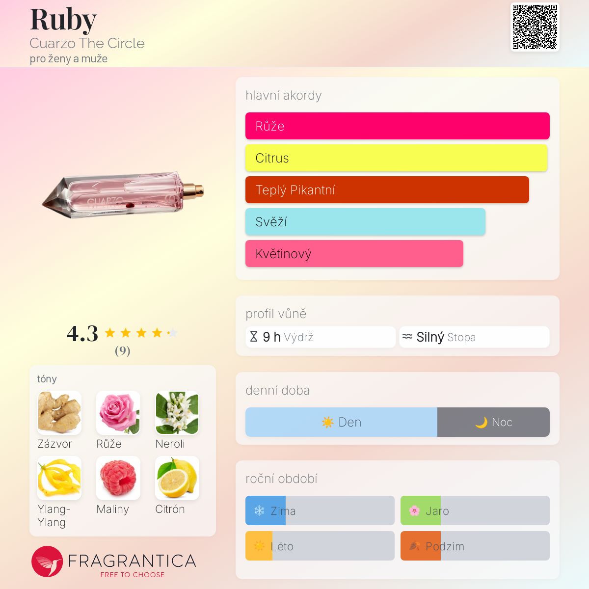 Ruby podle Cuarzo The Circle je Orientální Floral vůně pro ženy a muže. "Nosem" za touto vůní je Ramón Béjar. Vrchní tóny jsou Zázvor, Maliny a Citrón; střední tóny jsouRůže, Neroli a Ylang-Ylang ; základní tóny jsou Jantar (ambra), Vanilka a Benzoin.