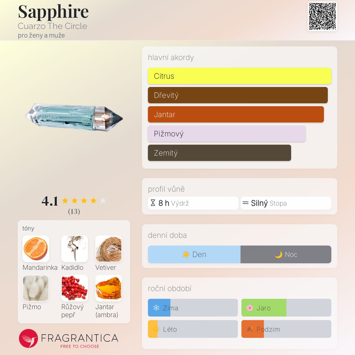 Sapphire podle Cuarzo The Circle je Citrus Gourmand vůně pro ženy a muže. "Nosem" za touto vůní je Ramón Béjar. Vrchní tóny jsou Italská mandarinka a Růžový pepř; střední tóny jsouKadidlo, Vetiver a Jantar (ambra) ; základní tóny jsou Pižmo, Cedr a Mech.